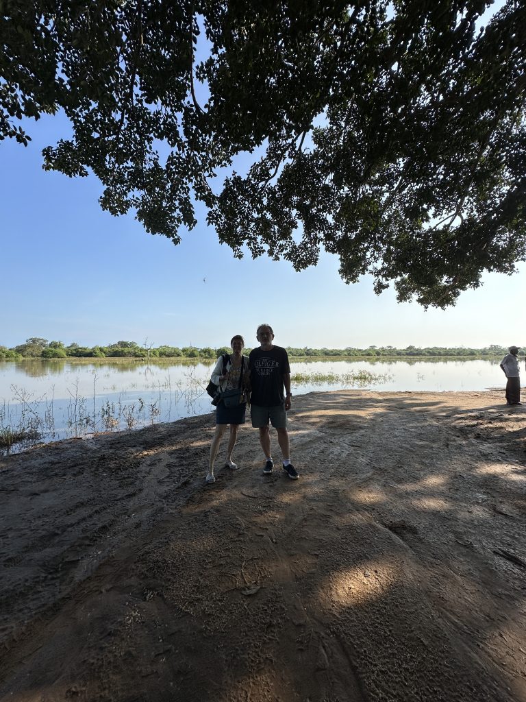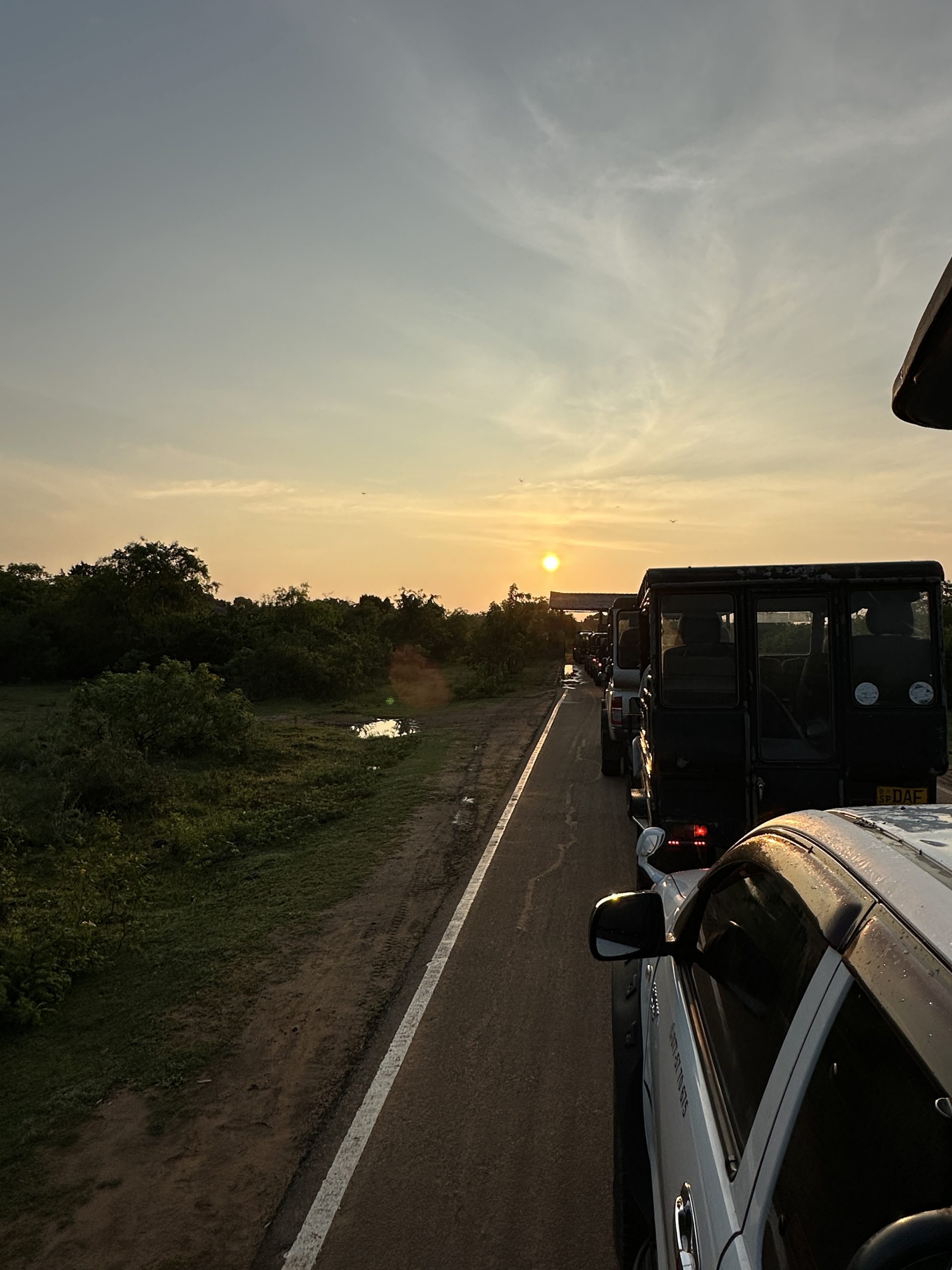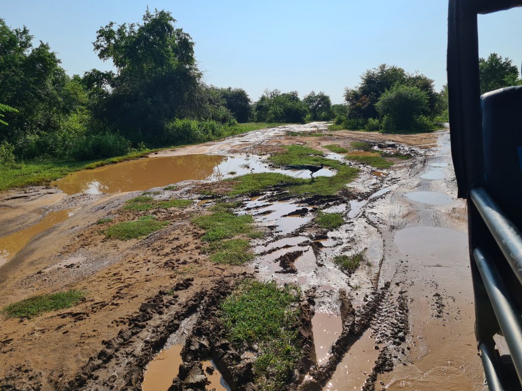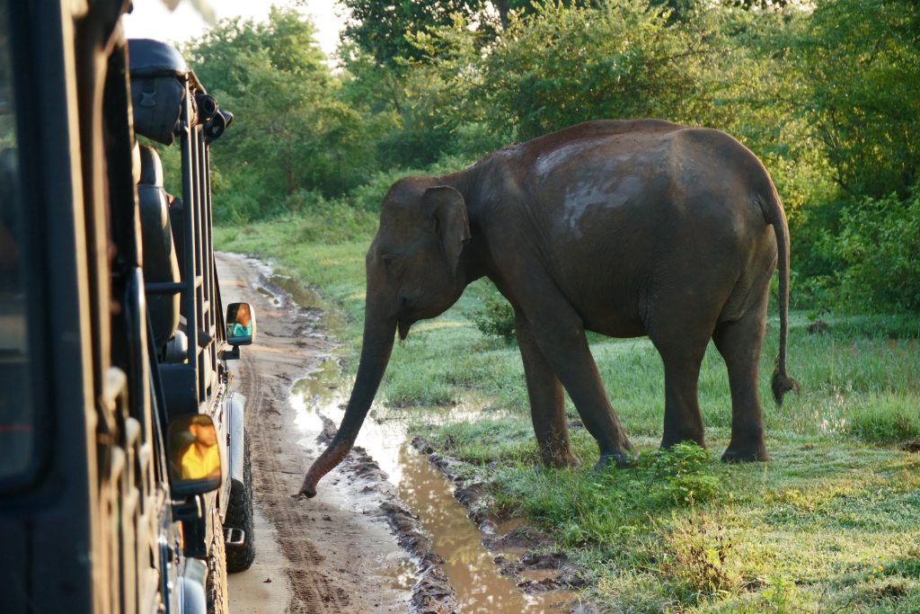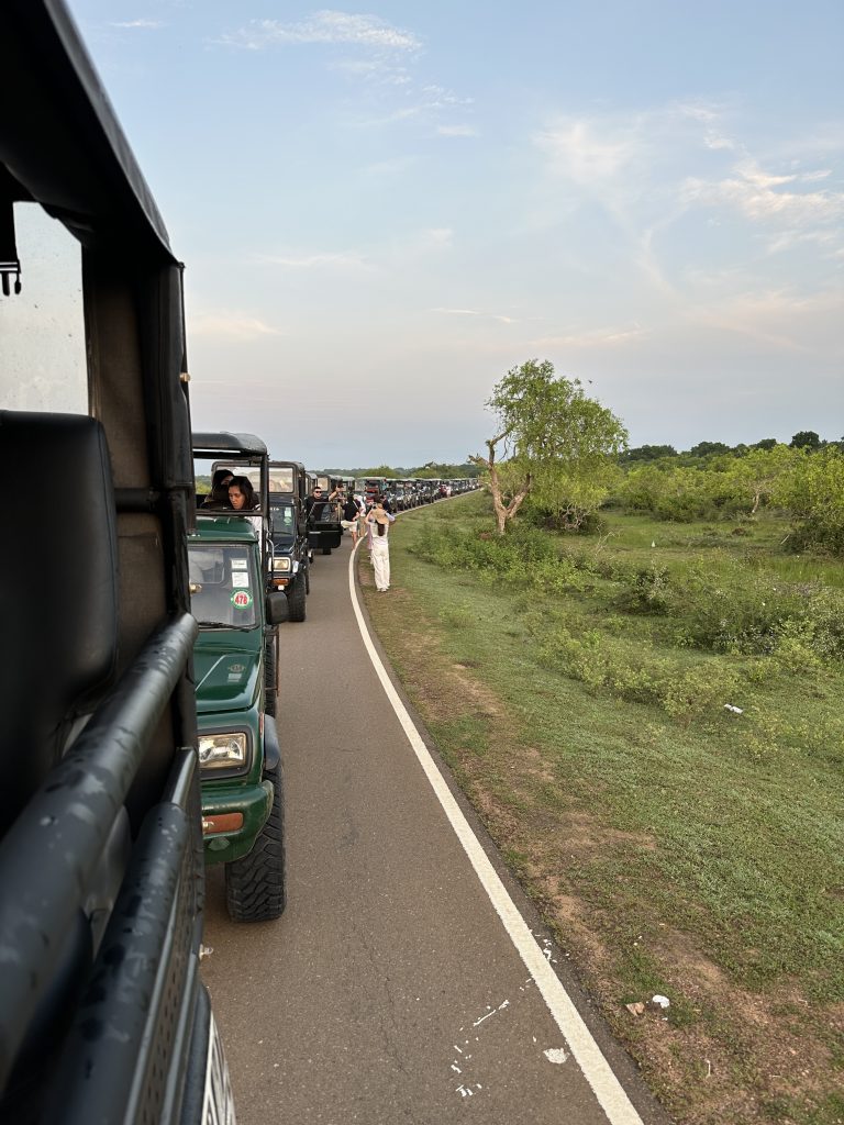 4:45 Uhr – es ist noch dunkel und wir stehen auf. Nach dem roomeigenen Kaffee stehen wir 40 Minuten später vorne an der Rezeption, nicht direkt allein, denn die vermutlich britische Jugendgruppe sorgt für Lärm, hier bekommen wir eine schwarze Tasche mit unseren Take-away-breakfast-Boxen, das je eine Banane, ein Croissant und ein Muffin und leider keinen Kaffee enthält, ausgehändigt. Wir gehen nach draußen, werden an den Jugendlichen vorbei zu unserem Fahrer eskortiert. Eigentlich ist hier die Hölle los, man fühlt sich wie in einem Hauptbahnhof mit drei gleichzeitig angekommenen Zügen: viele Jeeps, ein Kleinbus, sozusagen ein leichtes Durcheinander. Anfangs sind wir zu dritt, nach ein paar Kilometer stoppen alle Safariwagen an einem linker Hand gelegenen Häuschen mit ein paar Schaltern. Die Fahrer holen sich dort die Unterlagen für den Nationalpark. Hier steigt auch unser eigentlich recht netter Guide zu. Dann geht es ein paar Meter weiter, bis erneut alle Fahrzeuge stoppen — sicherlich an die 100 Jeeps hintereinander, die alle diszipliniert darauf warten, bis um 6 Uhr endlich die Nationalparktore geöffnet werden — vergleichbar wie beim Sommerschlussverkauf, wenn die Kaufhaustüren in der Früh geöffnet werden. In den ersten zwanzig Minuten bleibt es trotz der uns umgebenden schönen Natur beim Großstadt-Rush-Hour-Feeling. Fahren, bremsen, überholen, stoppen und Stau bei der ersten Tiersichtung, denn ein Elefant macht uns die Aufwartung. Irgendwann löst sich die Staubildung auf, man verliert kurzzeitig die vorausfahrenden Fahrzeuge aus den Augen, sieht relativ frische deutliche Leopardentracks im Sand und hofft damit auf das safaritypische Glück, als erster eines dieser faszinierend schönen Lebewesen zu entdecken. Es bleibt aber bei der Hoffnung: Außer insgesamt drei Elefanten, ein paar Krokodilen und Wasserbüffel im Wasser und Vögel will uns an diesem Vormittag keiner sehen. Das kräftige Grün der Pflanzenwelt, immer noch leicht glitzernd vom abendlichen Regen, die vielen oft malerischen Tümpel und auch die matschigen Wasserlöcher auf den Wegen und Straßen, die man spritzend durchfährt, verlieren nach zwei Stunden Herumfahren ihren Reiz. Ab 9:30 Uhr steigt dann spürbar unsere Unzufriedenheit und wir können es im Grunde nicht mehr herbeisehnen, wieder im Jetwing zu sein. In der Angst nichts mehr zum Frühstücken zu bekommen, rasen wir dort angekommen so schnell es geht — umsonst — in die Hotelkatakomben – das Restaurant befindet sich im Erdgeschoss. Unsere extreme Nervosität sinkt dann aber blitzschnell auf Zero – wir haben Gott sei Dank noch 33 Minuten Zeit. Das Frühstücksangebot ist groß, eigentlich gibt es alles, was das Herz begehrt. Negativ bleiben nur die Wartezeit auf die so wichtige zweite Tasse Kaffee und dass der mixed fruit juice billig — vermutlich zu 90 % aus Melone — schmeckt, hängen. Danach geht es zum Strand, 150 meter lefthanded in the other direction than yesterday, und anschließend zum Pool. Den Aufenthalt dort versüßen wir uns noch mit einem Pina Colada. Seitdem sitzen wir auf dem Balkon und verbringen den Nachmittag mit Lesen und Nichtstun auf dem Balkon.
