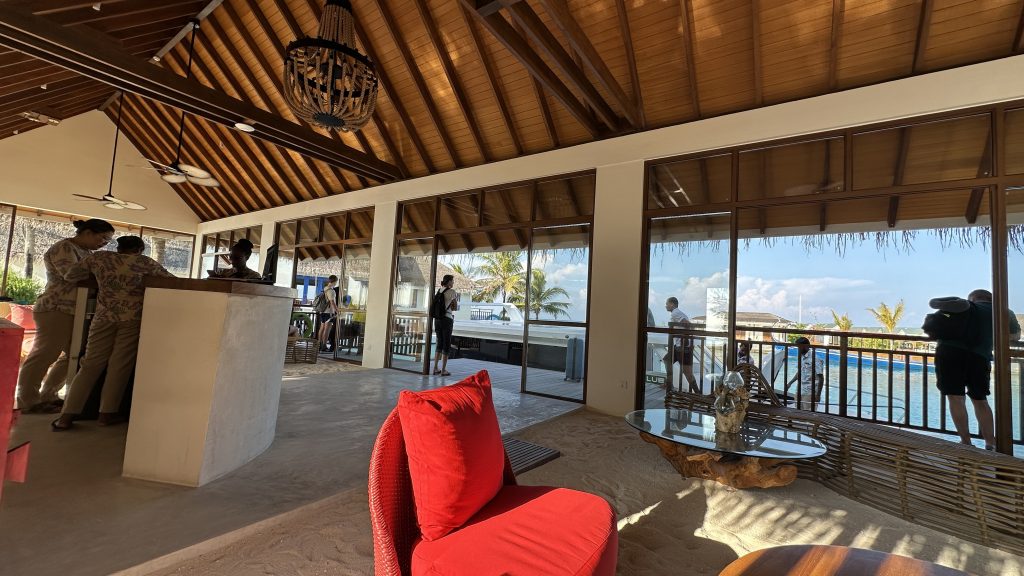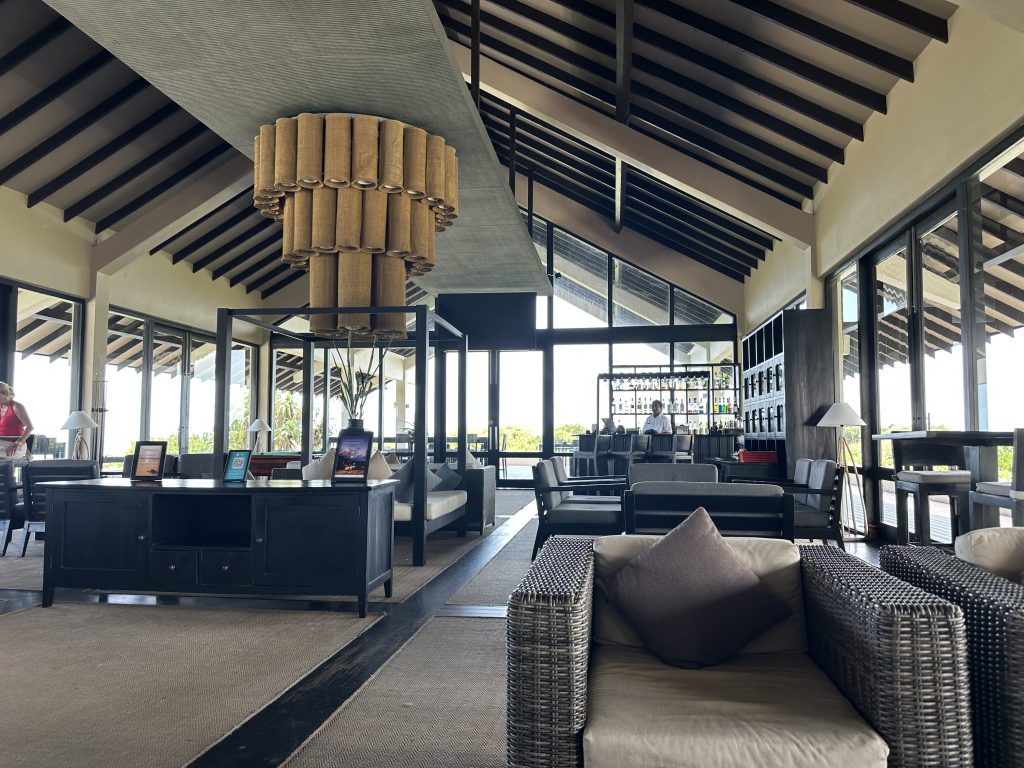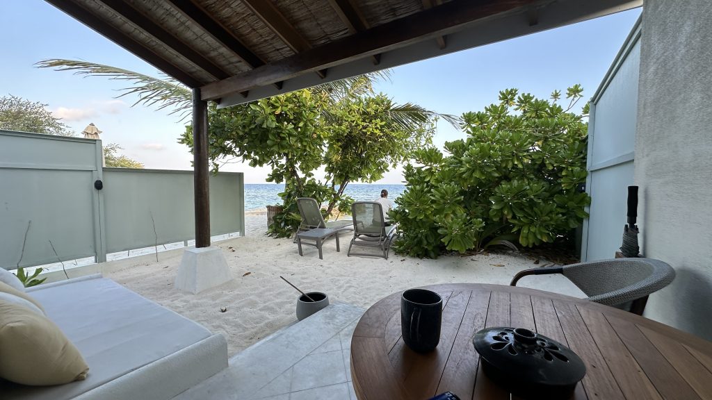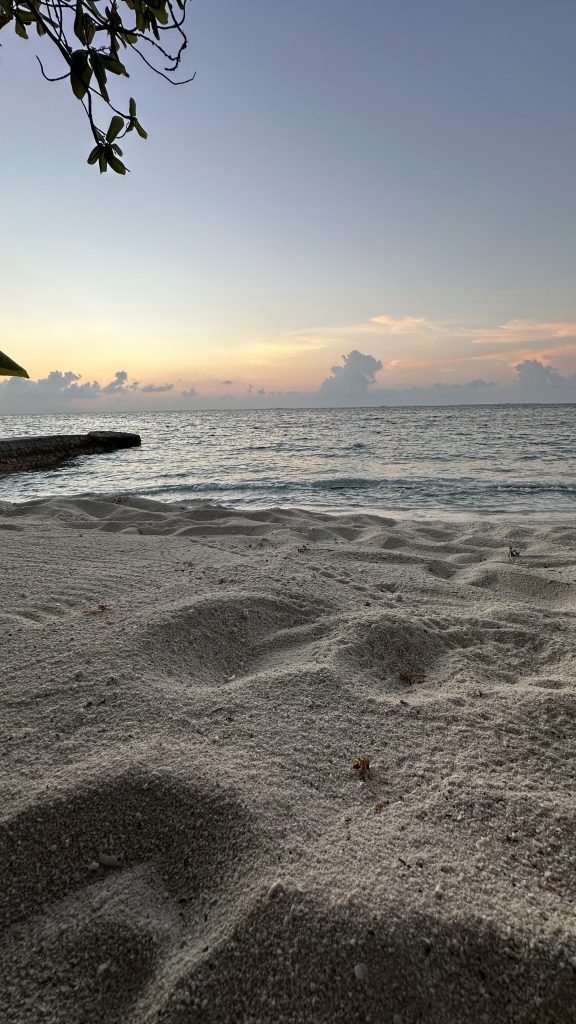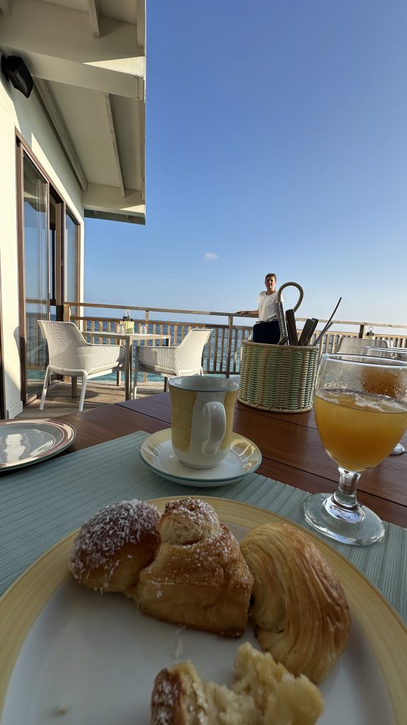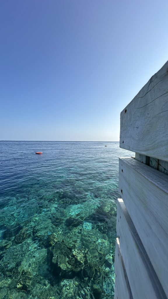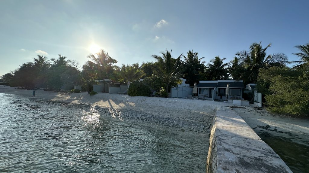 Der Tag wiederholt sich fast 1:1, auch hinsichtlich der Strafverfolgungsbehörden: Schon wieder wurden wir dabei ertappt, dass wir zu wenig waagrecht schwimmen und möglicherweise durch die herabhängenden Füße Korallen „zerstören“. Trotz Wiederholungstat belässt man es bei einer weiteren Ermahnung. Die einzigen Unterschiede im Tagesablauf: Nach dem Frühstück unternehmen wir noch eine riesige Wanderung – vielleicht 150 m (!) — zur Jetty und inspizieren beim Rückweg aus der Ferne die Water Villas, die uns so aber auch nicht überzeugen. Abends erhalten wir noch per Brief Instruktionen zur Abreise und checken vor dem Abendessen noch beim Concierge aus.