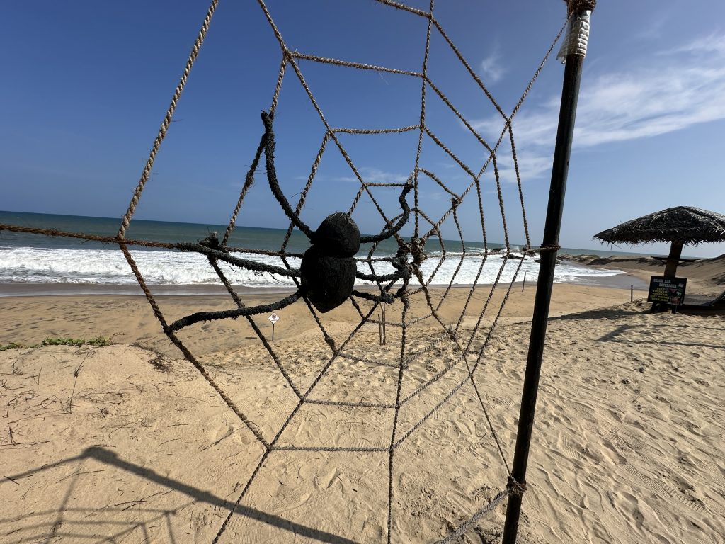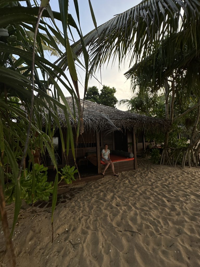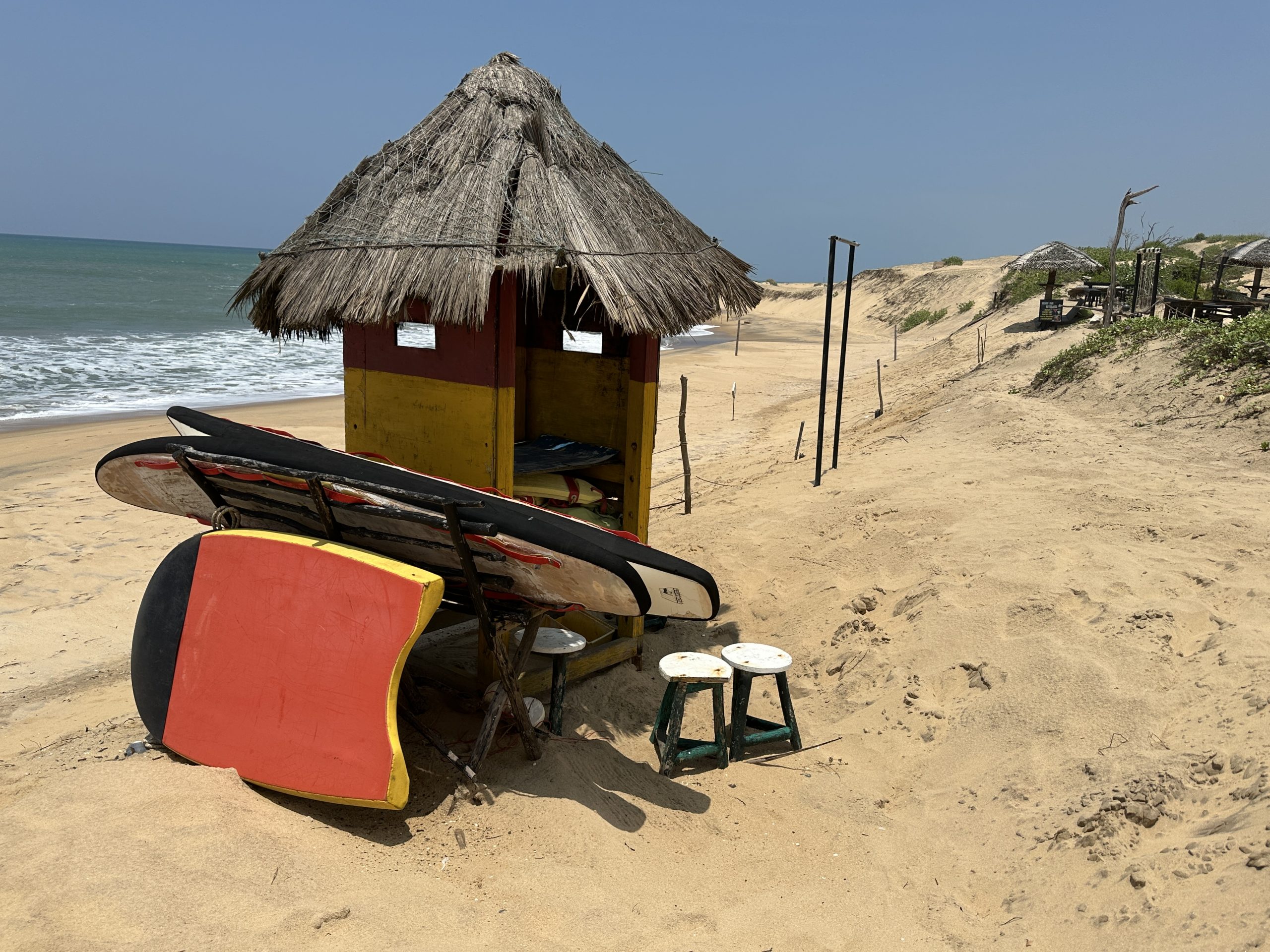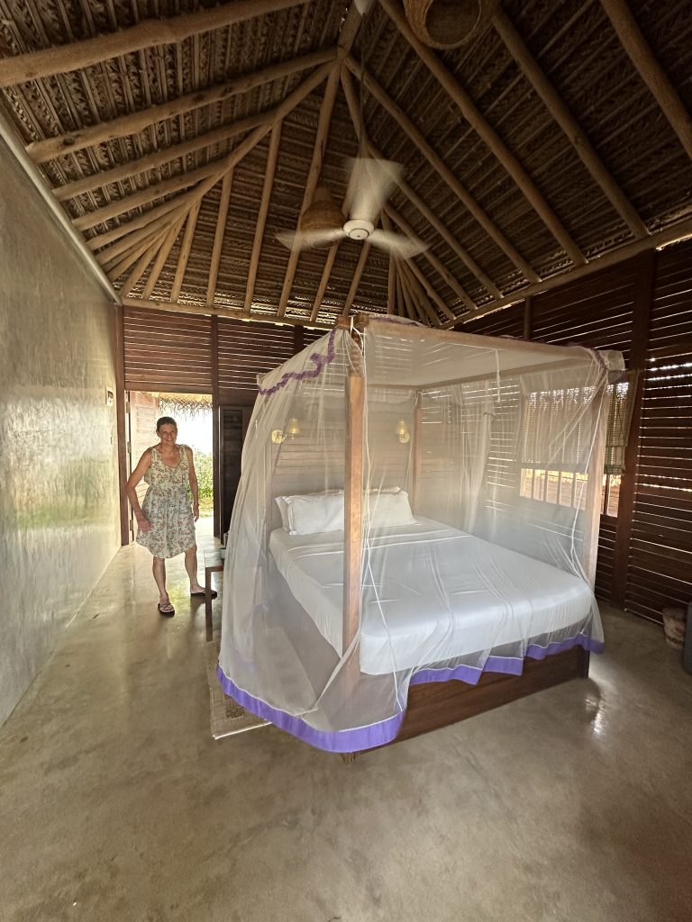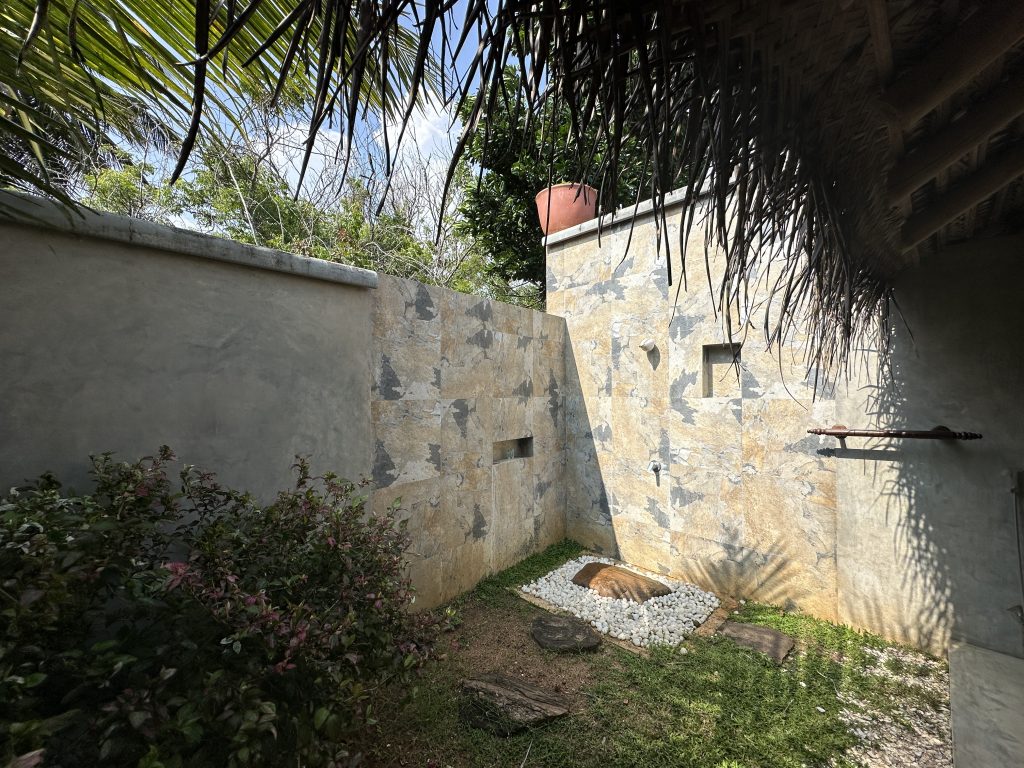 Noch im Liegen erledigen wir die Immigration für die Malediven: Hochladen der Ausweisdokumente, ein aktuelles Foto — just made with the iPad-camera — Eingeben der Flugnummern und des Ankunftflughafens, dann ist auch schon alles gemanagt. Nach dem first coffee in the room geht es zum Frühstücken: the same procedure than yesterday — mit dem Unterschied, dass der Saft eine Bananenmilch ist, die recht gut schmeckt, und wir den Affen beim Herumturnen auf den Bäumen zuschauen. Gegen 9 Uhr verlassen wir unser Zimmer mit der Nummer 304 und checken vorne an der Rezeption aus. Unsere Rechnung ist erfreulicherweise niedriger als erwartet, was wohl am Preis für die Safari liegt. Wir hatten per person kalkuliert — erfreulicherweise Geld gespart, angesichts des folgenden Fauxpas wenigstens etwas, denn ein teurer Spaß blüht uns mit der GoPro. Das Objektiv ist so verkratzt, dass wir sie nicht mehr hernehmen können. Bei der Ankunft im Jetwing hatten wir den Objektschutzdeckel im Auto vergessen, bei der Safari sie aber dennoch mitgenommen — und schon sind gut 400 Euro weg. Unser heutiges Ziel ist Tangalle, die wohl einzige Lodge ohne Klimaanlage Da Tangalle nur 90 km entfernt ist, lassen wir uns viel Zeit, befahren die kleinsten, zuweilen auch holprigen engen Nebenstraßen mit wirklich idyllisch anmutenden Siedlungen oder Häusern. Manches wirkt wirklich wie „heile Welt“ — keineswegs sind es in Armut lebende Menschen oder eine Ansammlung fragwürdiger billiger touristischer Angebote für Rucksackurlauber. So bleiben wir bei irgendeinem buddhistischen Tempel direkt am Meer stehen, „geraten“ in den Bandula-Nationalpark, fahren hier wirklich auf Wegen, die wohl nur Einheimische kennen, und erkunden zu guter letzt den Hafen bzw. Fischmarkt von Hambantota. Ab hier wird alles wieder lebendiger, die Tuktuks und Roller are back again und folglich ist das schnelle Stoppen am Straßenrand zum Fotografieren auch vorbei. Irgendwann links taucht auch schon das unauffällige Schild zu Mangrove Beach Cabanas auf. Einspurig, eng, dennoch mit Gegenverkehr, Weggabelungen, die zu anderen Unterkünften führen, — und dann sind wir auch schon am Ziel. Der Empfang ist strange: Man begrüßt uns formal ohne Lächeln, in dem man unseren Namen auf der Ankunftsliste sucht, und bringt unseren Koffer zur Villa 9 am Ende der rustikalen Holzchalets: 80 m vielleicht weg vom Meer, im Sand und unter Palmen, ein überdachtes „Bett“ draußen rechts von der Türe mit orangem leicht klebrigem Spannbettlaken, der kräftige Meereswind sorgt für Kühlung und macht die 34 Grad erträglich. Dann ist das Empfangskomitee auch schon wieder verschwunden. Hinweise, wann es Frühstück gibt oder das Abendessen, unterbleiben zu unserer Überraschung. Wir gehen dann noch einmal zum Auto, fragen selbst nach den Frühstückszeiten und bekommen — what a surprise — doch glattweg ein Begrüßungsgetränk. Seit dem Anfangsstrandspaziergang lungern wir auf besagtem klebrigem Laken mittlerweile selbst klebrig geworden vor unserer Cabana herum. Auf jeden Fall ist diese Unterkunft auch eine besondere Erfahrung — nach dem Jetwingyalaluxus und wenige Tage vor den All-Inclusive-Days auf den Malediven. Das Essen lassen wir ausfallen, maybe good shortly after the past and the following days. Die Dusche hinter unserer Cabana ist – genauso wie das WC samt wenig einladenden Klodeckel — open air. Der Gegensatz könnte nicht größer sein.
