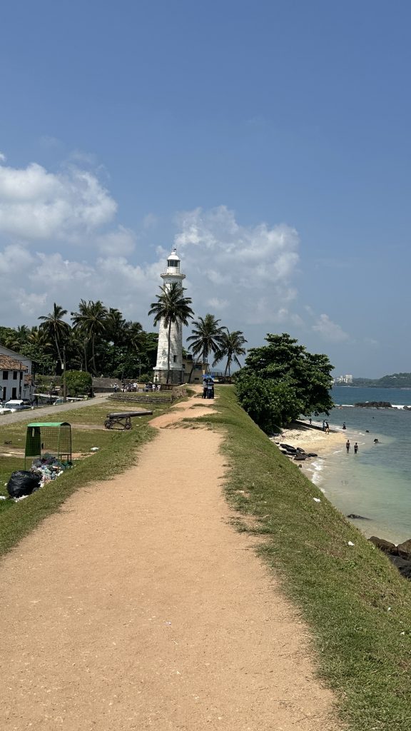 Die letzten Utensilien aus dem Zimmer geholt checken wir danach aber aus. Noch in Tangalle fotografieren ein paar Schiffchen und Malereien auf dem den Hafen begrenzenden Holzzaun, dann bleiben wir stehen beim blowing hole in Kudavella — mit netter Parkplatzfrau und dem fairen Kassier, der uns vor dem Zahlen darauf hinweist, dass das blowing hole heute auf das Blasen verzichtet. So sparen wir uns dies, kehren um und fahren weiter. Ungeplant ist auf jeden Fall auch noch der nächste Stopp: das Lighthouse von Dondra. Je weiter es gen Westen geht, umso mehr ist links und rechts alles bebaut — geprägt von billigtouristischen Angeboten und offensichtlich auch von europäischen Jungurlaubern. In Mirissa, das ja in jedem Reiseführer erwähnt wird, bleiben wir nicht einmal stehen, in Weligama fotografieren wir am Strand ein paar Schiffe. Die dort erwarteten stick fishers sehen wir erst bei Ahangama — auch wenn wir nichts bezahlen müssen, erkennt man sofort, dass zumindest diese nur noch als Touristenfalle dienen. Kurz darauf erreichen wir auch schon das hochgelobte Fort in Galle mit ebenfalls offensichtlichem Massentourismus — bei fast 35 Grad und Schweißperlen kommt auch hierfür keine Begeisterung auf. Unser ausgewähltes Hotel — das Brixia Cafe & Guest — passt sich dem Niveau an, es befindet sich noch mitten in der Stadt in einer engen Straße mit ebensolchem Parkplatz mit Zimmer im 3. Stock mit halbfunktionierender AC mit einem langen schmalen Balkon, der für Raucher geeignet sein mag, für alle anderen Zwecke aufgrund des umgebenden Lärms aber absolut unattraktiv ist. Erfreulich ist, dass die gerügte AC noch besser funktioniert als der Ventilator im letzten Hotel und dass es weniger Fliegen gibt.