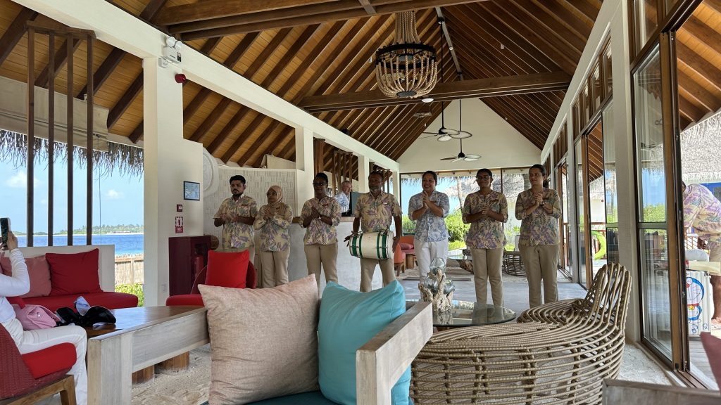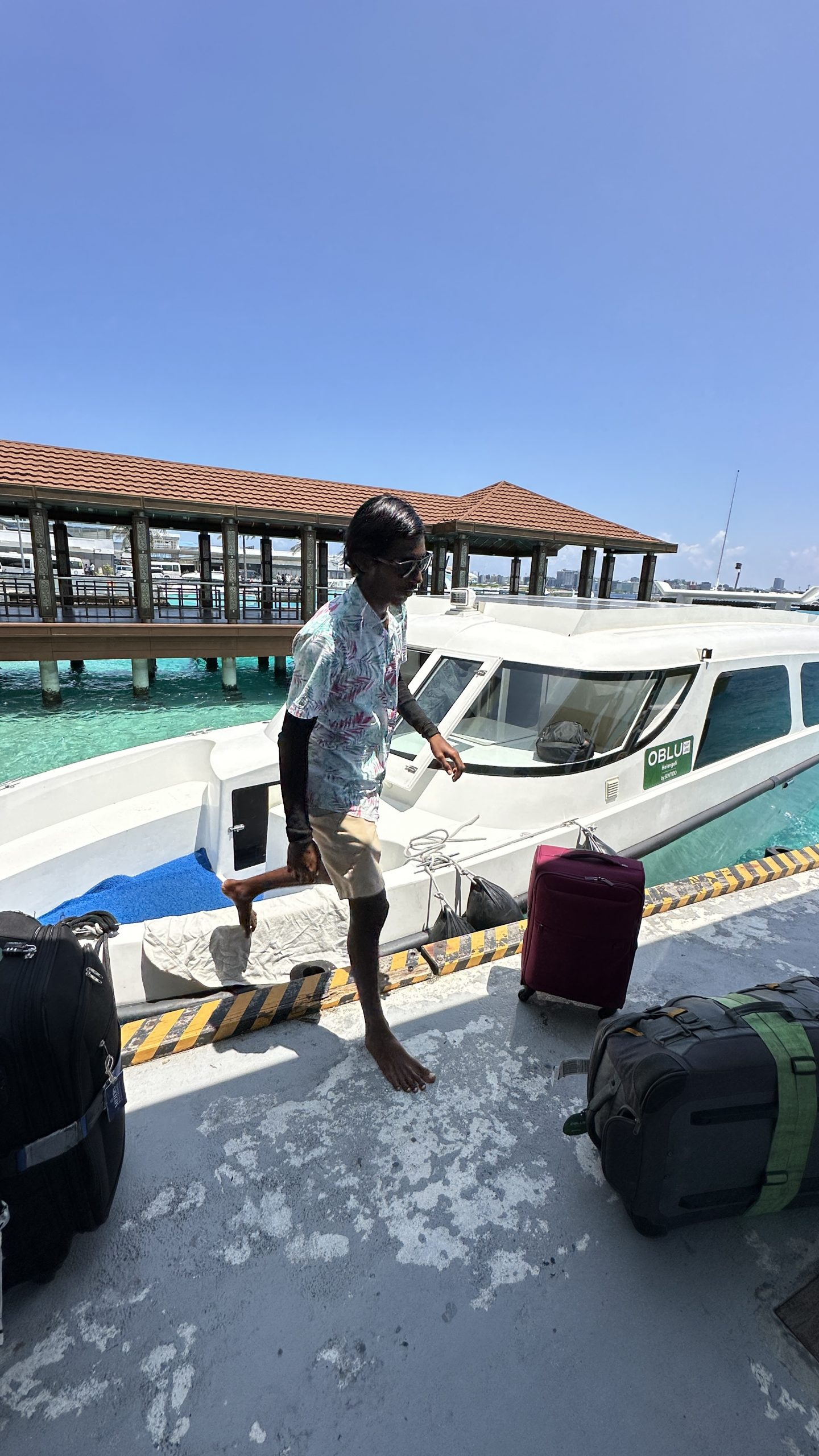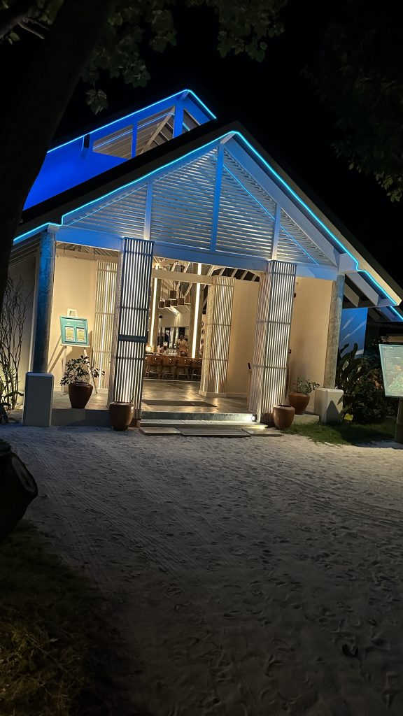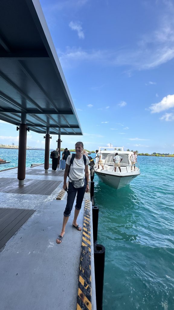 Das Auschecken samt Transport verläuft reibungslos, das Einchecken verwundert uns etwas, denn vor den Schaltern ist eine erste Security vorgeschaltet, bei der alles durchleuchtet wird. Eigentlich müssen wir uns zweimal am Schalter anstellen, denn für unseren Flug sind wir zu früh dran. Beim Gate gibt es dann eine zweite Durchleuchtstation. Unsere Abflugzeit verzögert sich aufgrund eines Gewitters etwas, Male erreichen wir gegen 11:45 Uhr. Die Immigration geht recht zügig vonstatten, beim Baggage Claim dauert es etwas länger. Nichtsdestotrotz sind wir happy, als unsere Koffer mit ihren auffälligen doppelten gelben und grünen Bändern endlich auf dem Claim erscheinen. Dann geht es Richtung Exit — wir biegen um die Ecke — und werden von Hunderten Schildern und Displays „erschlagen“. Etwas ratlos gehen wir weiter, suchen ein DER-Schild und finden eine Sentido Oblu Helengeli-Dame, die uns zu sogar zu einem so benannten Schalter führt, an dem alle, die in diesem Resort an diesem Tag ankommen und vermutlich auch mit dem gleichen Flieger gekommen sind, zum Warten abkommandiert werden. Zu Fuß geht es dann zum Boot, in das zunächst das Gepäck und dann auch die Passagiere höflich hineinkomplementiert werden — ohne Blick aufs Meer — so fühlt man sich ein wenig wie in einer abgeschlossenen Fahrgastzelle zum Touristenobjekt degradiert. Irgendwann kurz nach 14 Uhr erreichen wir dann unsere Insel — mit ritualisiertem Empfang mit Sekt und Liedchen samt Trommel. All das wirkt wie ein professioneller tagtäglicher Ablauf, in dem everybody — ob Tourist oder auch Beschäftigte — erwartungsgemäß ihren Job erledigen. Dann werden wir zum Zimmer gebracht, vielleicht 150 Meter auf einem schattigen, sandigen Weg. So ganz sicher ist unser Girlie auch nicht, ob wir jetzt da oder da untergebracht sind. Beim zweiten Versuch sind wir aber an der richtigen Stelle: Es erfolgt eine unpersönliche Kurzeinweisung mit Betonung auf „kurz“. Das Zimmer an sich ist recht schön, aber relativ klein, die AC funktioniert bestens und der wunderschöne Sanitärbereich ist sehr geräumig und an der frischen Luft. Zum nächsten Häuschen ist der Abstand nur wenige Meter, abgetrennt von einem ca. 1,5 m hohen und damit im wahrsten Sinne des Wortes überschaubaren Zaun, an dem man — um zur Eingangstüre zu gelangen — im Grunde über einen recht schmalen „Durchgang“ entlanggehen muss. Den Zugang zum Meer muss man sich dann fast mit den neighbours teilen — links mit Deutschen bzw. rechts mit Österreichern, was man nicht überhören kann. In der Hoffnung, noch eine Kleinigkeit zum Essen zu bekommen, „wandern“ wir bei 35 Grad nach vorne, wobei wir es wohl dem Osterfest zu verdanken haben, dass die Lunchtime an diesem Tag anscheinend „ausgeweitet“ wurde. So „versorgen“ wir uns relativ bescheiden am Buffet, um anschließend wieder zur heimischen Kleinvilla zurückzukehren. Den restlichen Nachmittag verbringen wir dann teils in der schwülen Hitze, teils im gut gekühlten Inneren unseres Häuschens. Um kurz nach 7 Uhr gehen wir dann vor zum Dinner und bekommen Gott sei Dank einen recht angenehmen ruhigen Platz draußen, wobei dennoch das vornehme Wort „Dinner“ eher unangebracht zu sein scheint. Insgesamt ist und bleibt es vergleichbar mit der altbekannten Las Vegas-Luxor-All you can eat-Atmosphäre.