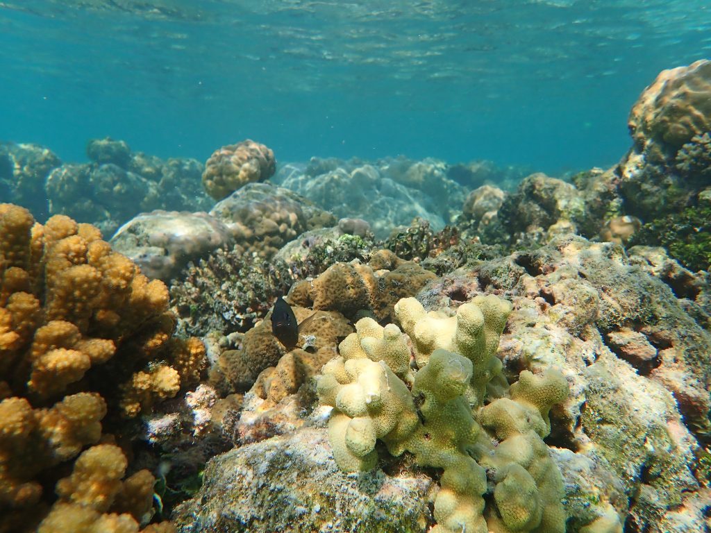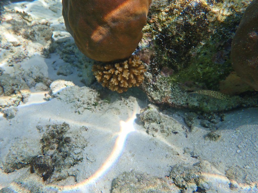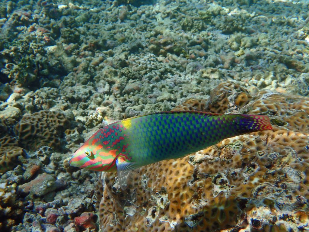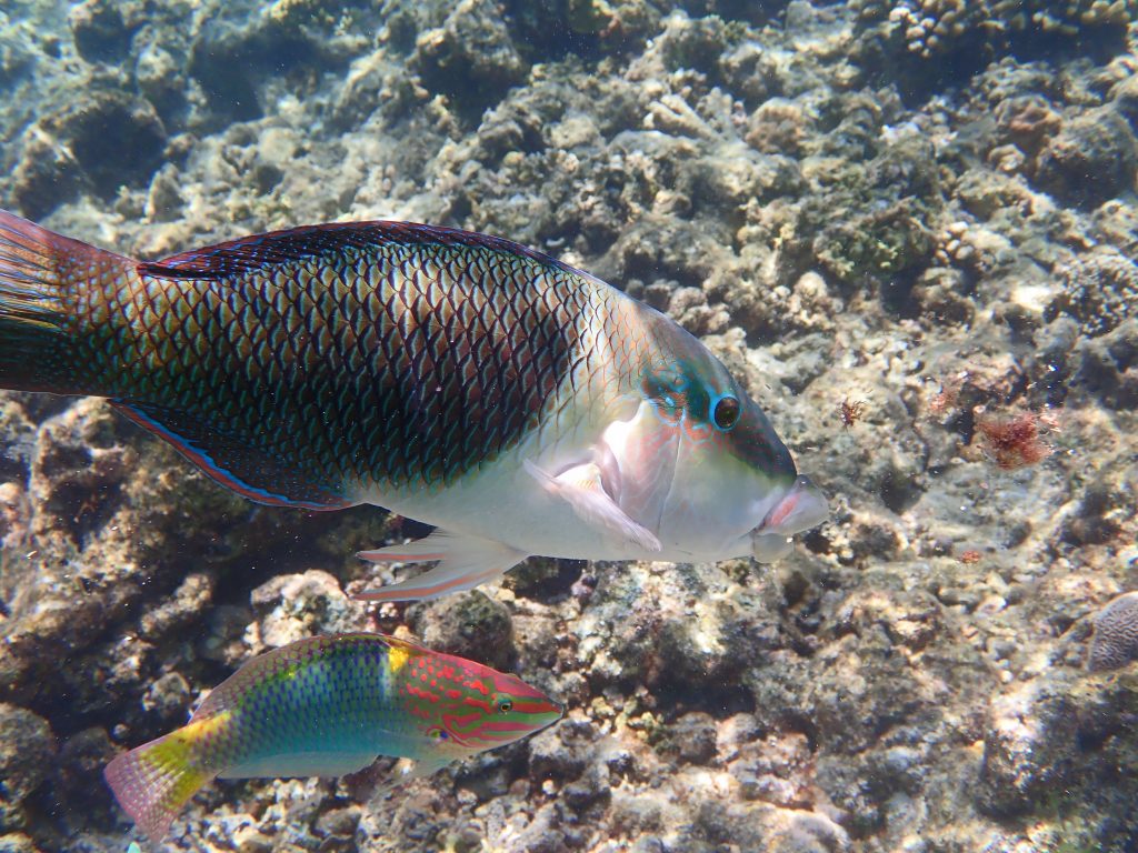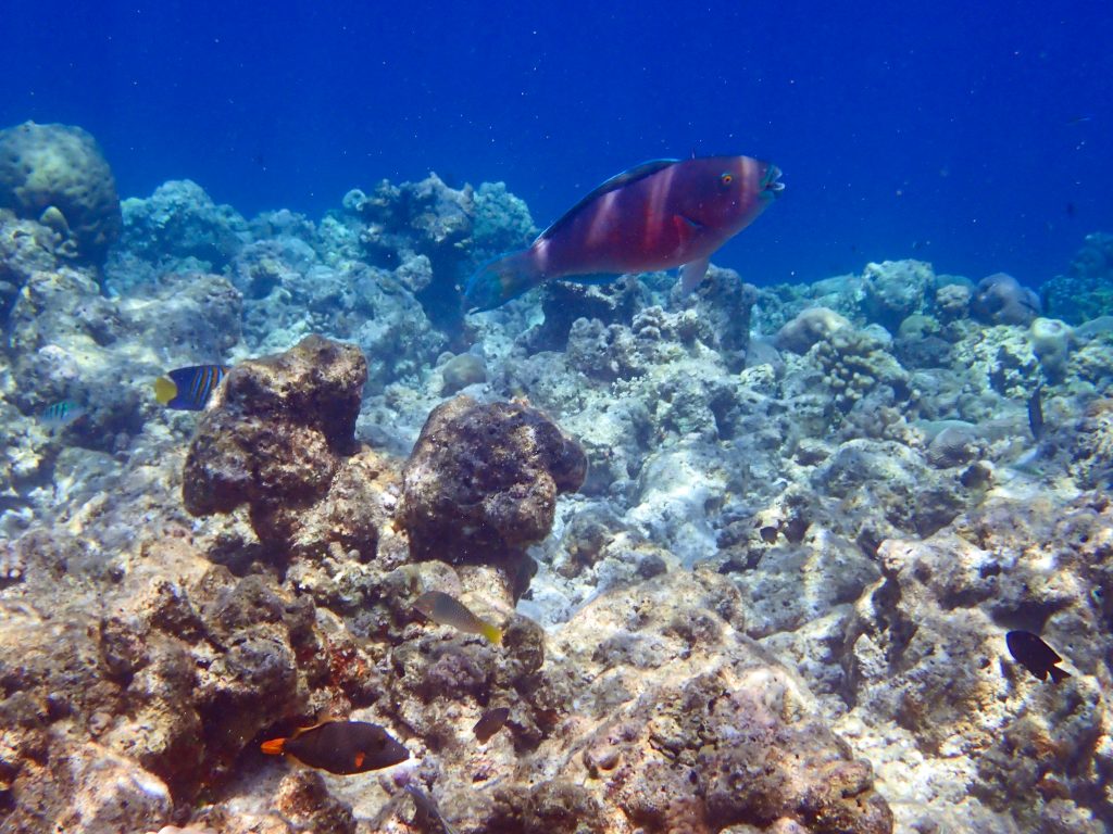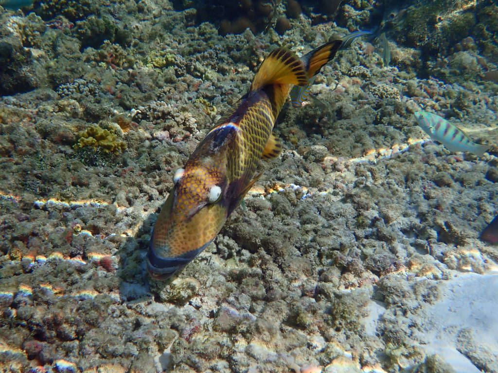 There is not a lot of to do: Frühstücken – Schnorcheln – Lunch – Schnorcheln – Dinner. Das Essensangebot ist recht eintönig, große Variationen gibt es nicht, vielleicht bei den Süßigkeiten: Statt Kakaokuchen gibt es Schokoladenkuchen, aber das ist auch schon alles. Wir wagen es tatsächlich mit Taucherbrille samt Schnorchel uns im Wasser oberhalb der Korallenriffe schwimmend zu bewegen, verletzen uns sogar dabei etwas — und werden von der ortsansässigen Korallenpolizei gerügt. Unsere Unterwasserkamera kommt aber dennoch zum Einsatz und das eine oder andere Foto gelingt, auch wenn man manchmal eher „blind“ auf den Auslöser drückt und gar nicht in der Lage ist, den gewünschten Bildausschnitt zu kontrollieren.