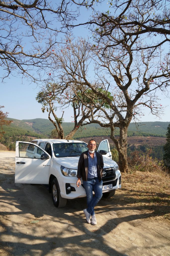 Unser gewünschter Hilux – ein weißer – war mit 52000 km zwar nicht so neu wie erhofft, hatte auch kein Navigationsgerät wie angekündigt, war aber stattdessen mit Automatikgetriebe und erfreulicherweise mit Rückfahrkamera. Dann ging es schon auf die Autobahn, um zügig den Großraum Johannesburg zu verlassen. Die ersten 300 km war dann eine eher landschaftlich langweilige Fahrt bei diesigem Himmel. Die seitlich der Fahrbahn niedergebrannten 50 m Wiesen- oder Gebüschstreifen verstärkten diesen eher negativen Eindruck auch noch. Nichtsdestotrotz kamen wir recht zügig voran. Interessanter wurde es erst ab Sabie auf dem Weg zu unserer ersten Lodge mit dem Namen Timamoon. Gerade die letzten 4 km auf der engen unpaved Road machte dann richtig Spaß. Über die kleine Holzbrücke über den Sabieriver beim Eingangstor ging es dann sogar mächtig eng her. Hier wurde unsere Temperatur per Messgerät gecheckt und 2 km wurden wir dann auch schon erwartet. Übertroffen wurden auch unsere Erwartungen hinsichtlich unserer Zimmer. Unser Zimmer heißt Bombaymoon und ist kein Zimmer, sondern eine asiatisch, vielleicht etwas esoterisch angehauchte Villa mit vielen kleinen liebevoll gestalteten Elementen. Unsere Villa hat natürlich einen kleinen Pool – leider ist das Wasser eiskalt –, eine Außendusche, ein Outdoorbett, innen ein Himmelbett, einen Kamin und ein WC, das wahrlich nicht nicht normal ist. Im ersten Stock, den man nur über die Außentreppe erreicht, gibt es noch eine Aussichtsterrasse mit einem wunderschönen Blick auf die grünen Hügel um uns. Ein kleines Detail ist das Schloss für unser Wohn- und Schlafzimmer, das sich mit zwei riesigen tollen Holztüren zum Pool hin öffnet: eine Querstange mit Vorhängeschloss. Dass die Villa nicht einsehbar ist und ein äußeres Eingangsportal hat, muss man natürlich auch noch erwähnen. Der Außenbereich in der gesamten Anlage mit nur 7 Villen ist dann „schön gestaltete Natur“ – ohne in diesem Bereich übertrieben zu wirken. Esoterischer Luxus pur, für den ersten Abend nach dem insgesamt doch anstrengen Tag aber eine Freude. Um 19 Uhr gibt es dann noch das Abendessen. Negativ ist vielleicht, dass Wifi nur im Restaurant und in der Rezeption geht – etwas aufwändig, da diese Gebäude wohl 500 Meter von unserer Villa sind.