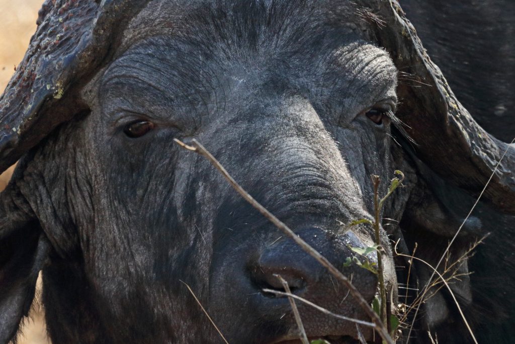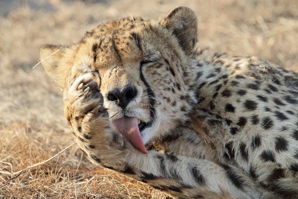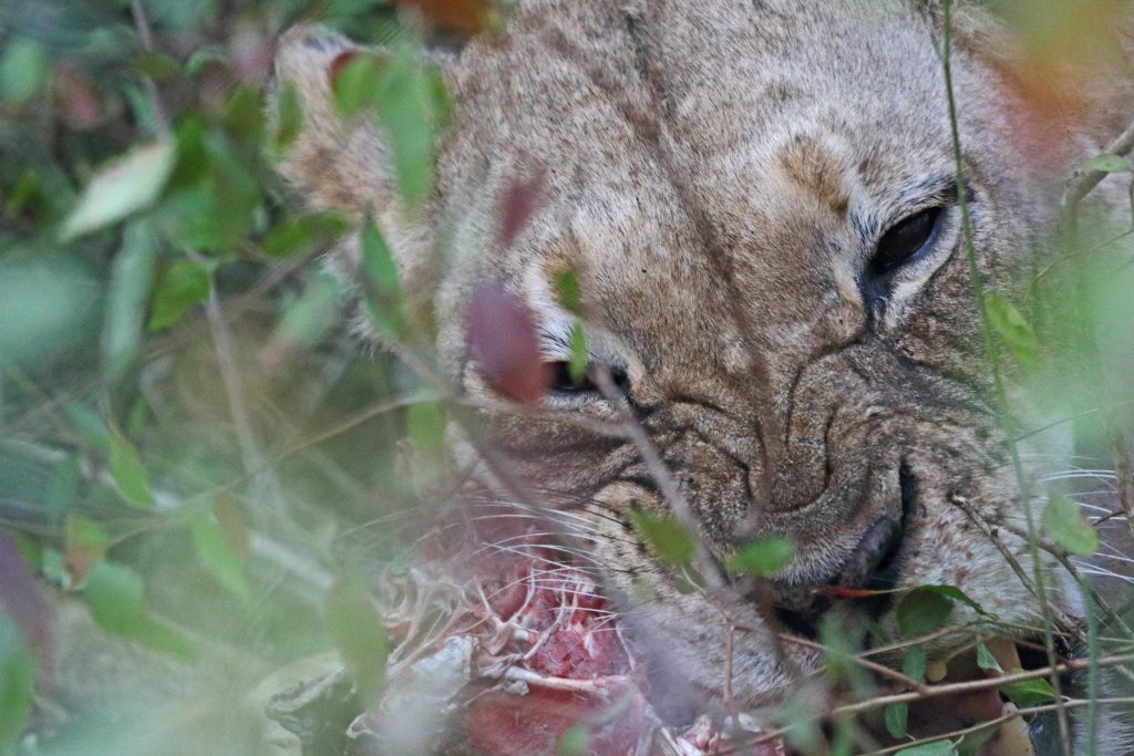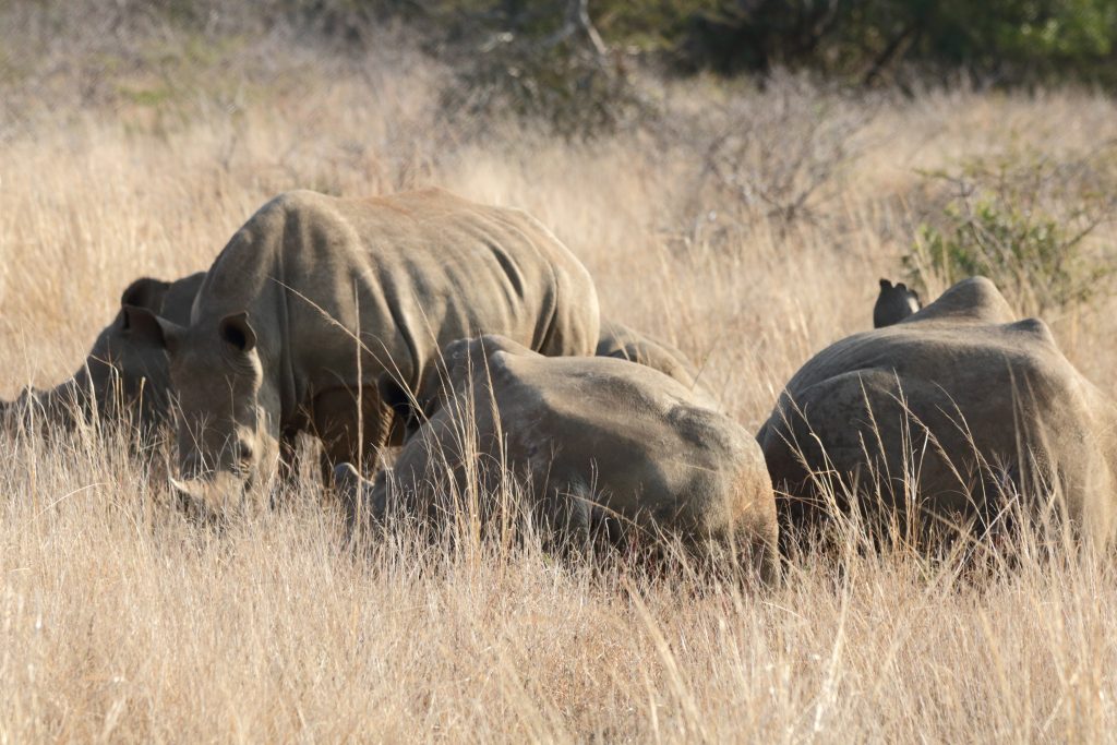 Auf den Lunch – Fisch, Curryreis mit Boboti und anschließend ein Schokocupcake — verzichten wir teilweise. Der Nachmittagsgamedrive erfolgt mit vollem Wagen, denn drei Franzosen, die in Südafrika leben, stoßen zur Vormittagsgruppe dazu. Er startet mit einem Highlight, einer Gepardin, die genüsslich ihre Beute verspeist und einem Schakal, der sich massiv beschwert, dass er nichts davon abbekommt. Drei müde Löwinnen, die uns kaum beachten, sind der nächste Höhepunkt. Ein kleines Elefantenbaby, ein Nashorn und die uns schon vertraute Büffelherde vervollständigen die Big Five an diesem Tag.