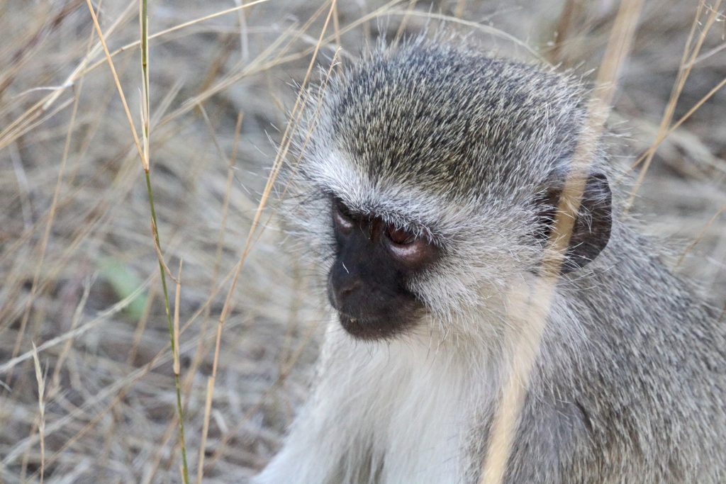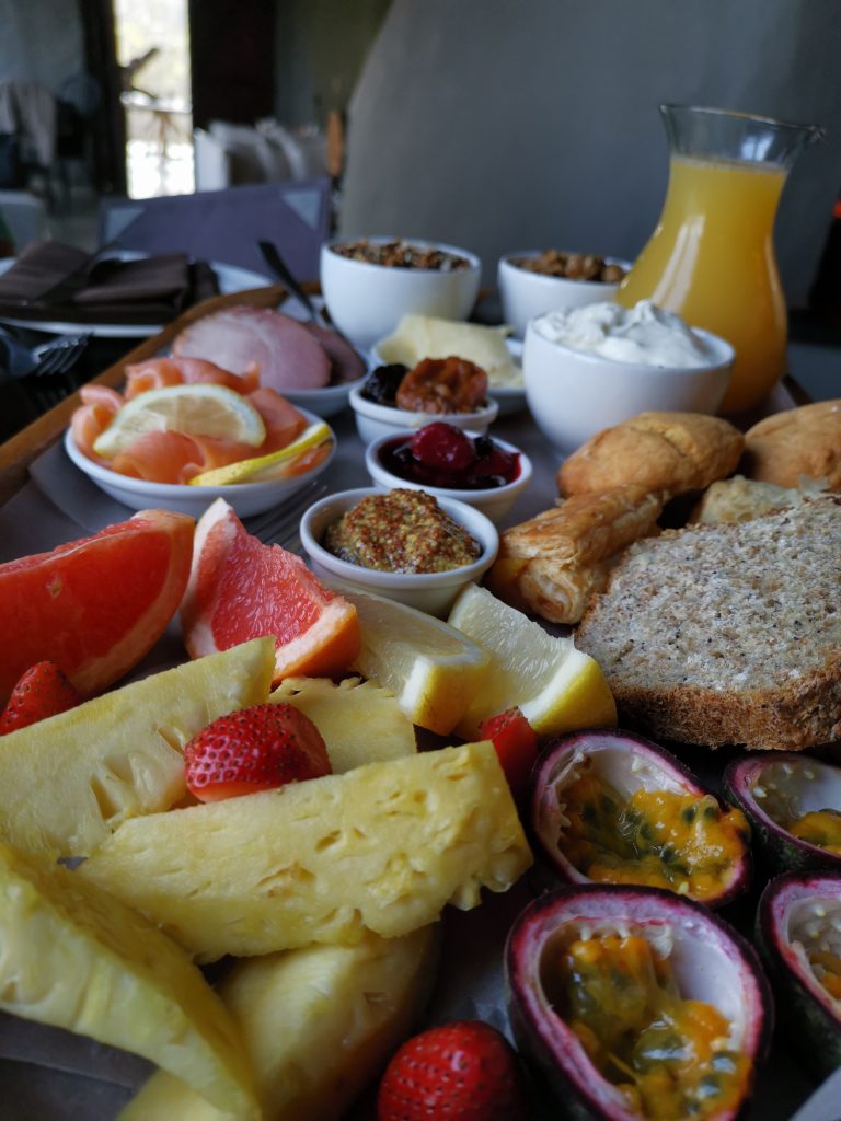 Das Frühstück um 8 Uhr – die Koffer haben wir natürlich schon ins Auto gebracht – führt das Dinnererlebnis fort. Serviert wird es an der frischen Luft, direkt vor dem Restaurant oberhalb des kleinen Wasserteichs mit exotischen Fischen, wir sitzen leicht erhöht in der Sonne und sind natürlich die ersten Gäste. Egal, ob das gereichte Brot, die Eierspeisen, der Joghurt mit Früchten und Honig oder die zuletzt gereichte Zimtschnecke — alles perfekt. Topp war auch die Abrechnung. Wir können direkt am Tisch per Kreditkarte unsere 50 Rand für das Wasser und Kaffee bezahlen und müssen nicht mehr an der Rezeption auschecken. Den ersten Blickkontakt mit den wild animals konnten wir auch genießen – ein paar Meerkatzen turnen in den Bäumen herum.