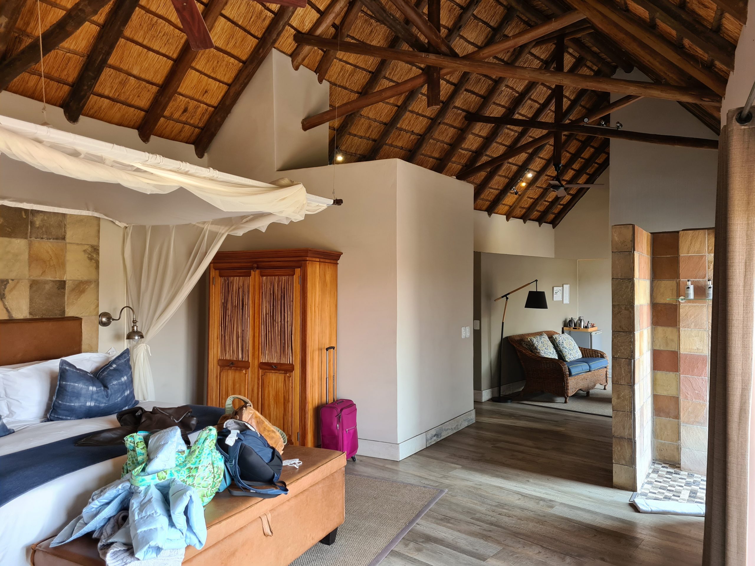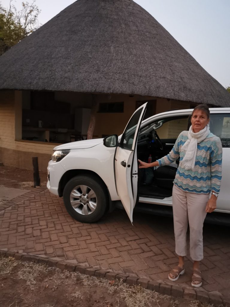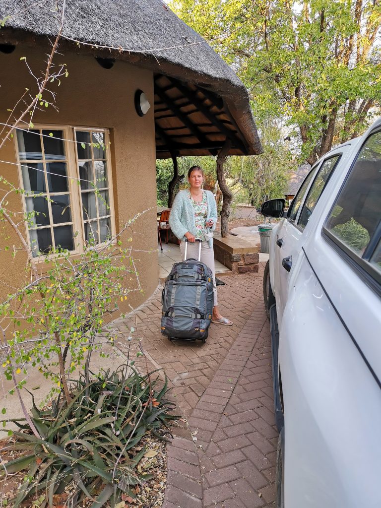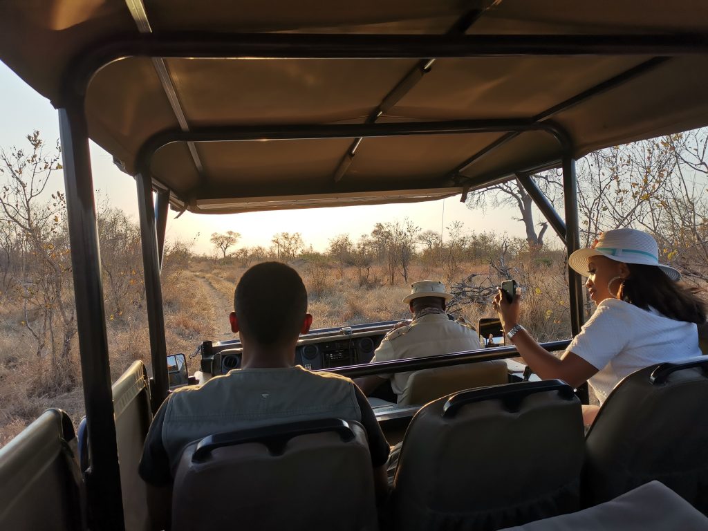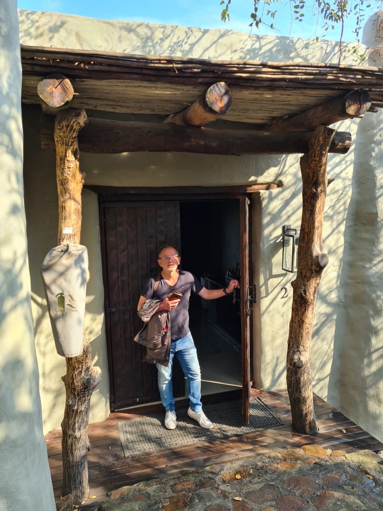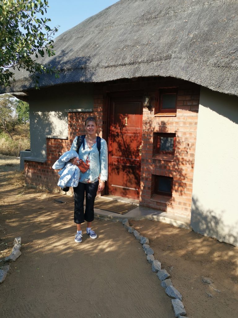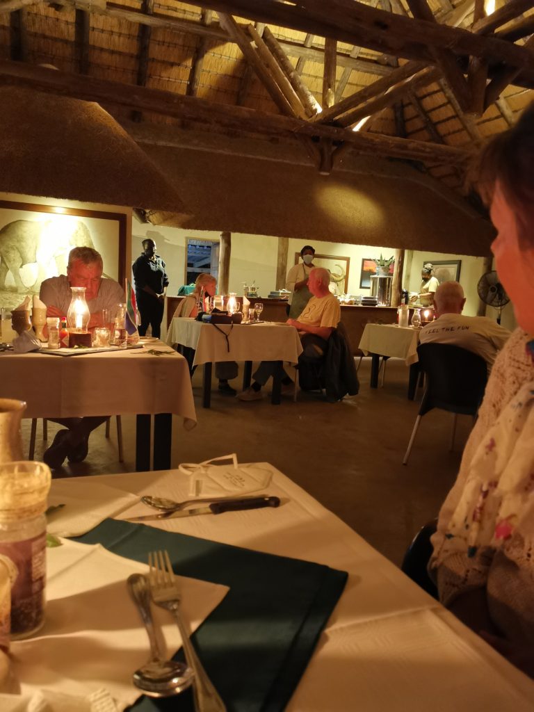 Um 15:30 Uhr geht es los, zunächst starten nur wir zwei alleine im Safariwagen, dann kehren wir nochmals zurück und holen zwei weitere Gäste ab — eine junge, ständig quasselnde Frau samt Partner. Mit Leopardenjäckchen, drei Zentimeter langen Fingernägeln und superauffälligen Augenbrauen stellt sich als Influencerin aus Sabie vor und schafft es doch fast durchgängig in ihr Handy ihre Beiträge für ihre Follower zu produzieren. Den geplanten Teil mit ihren German Friends, womit wir natürlich gemeint sind, verweigern wir relativ entschieden. Aus dem erhofften, friedlichen Na-turerlebnis – auch weil wir kaum Tiere zu Gesicht bekommen – wird nichts. Gegen 19 Uhr sind wir wieder in der Lodge, wo wir mit einem gereichten warmen Frischetüchchen samt Gläschen Amarula empfangen werden. Das Dinner – eine Blumenkohlsuppe, ein Steak vom Strauß, eine Lemonkuchen und eine Birne mit Kaffeesauce – können wir „distanziert von ihr“ wieder genießen. Das Personal trägt seinen Teil dazu bei, ist sehr aufmerksam, freundlich und zu kleinen Späßen bereit. Kurz nach 20 Uhr sind wir wieder in unserem Zimmer, wobei wir auf dem Weg vom Restaurant von einem jungen Mann „eskortiert“ wurden.