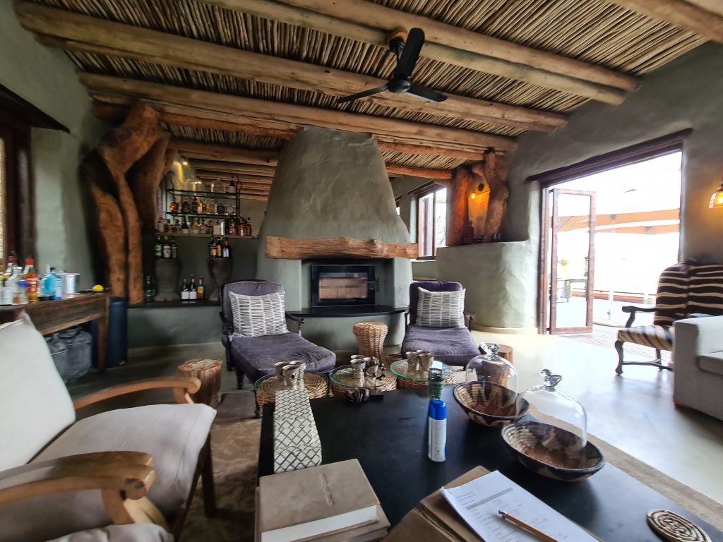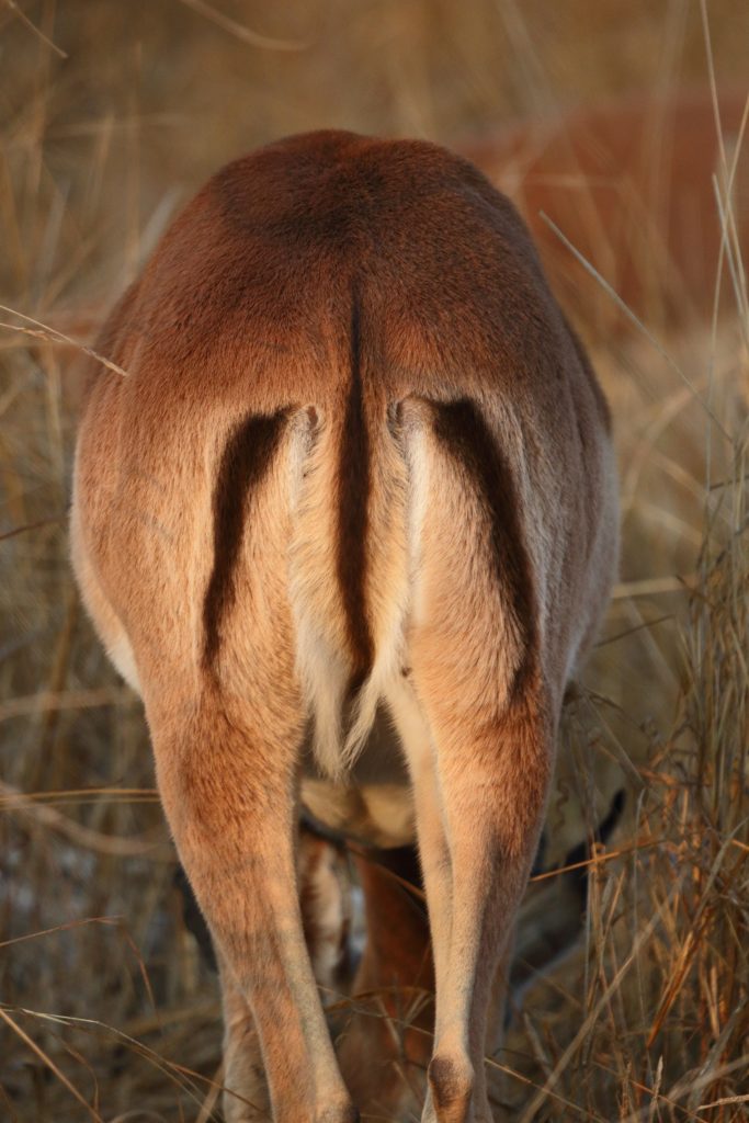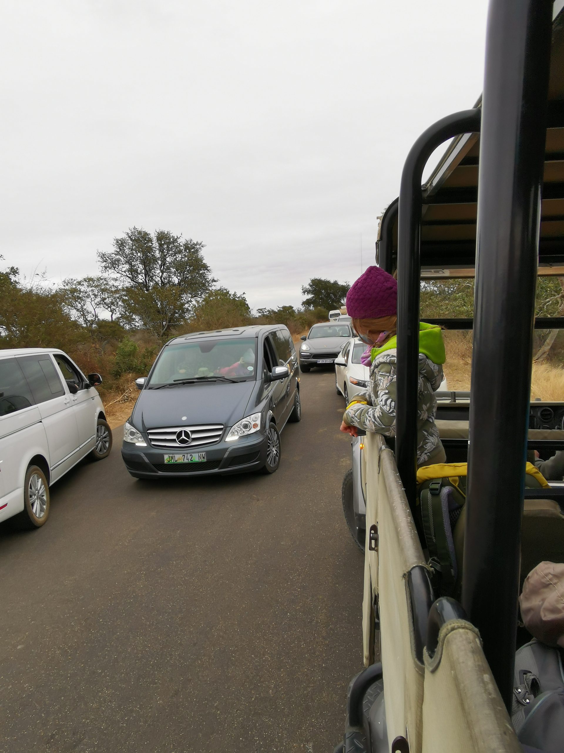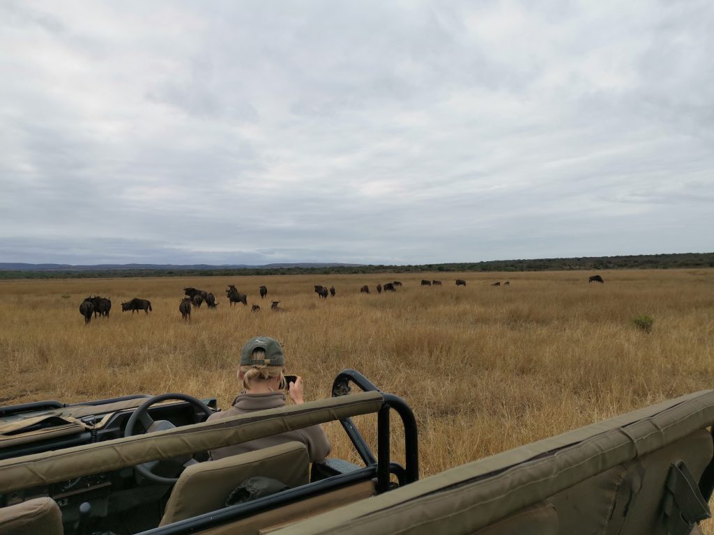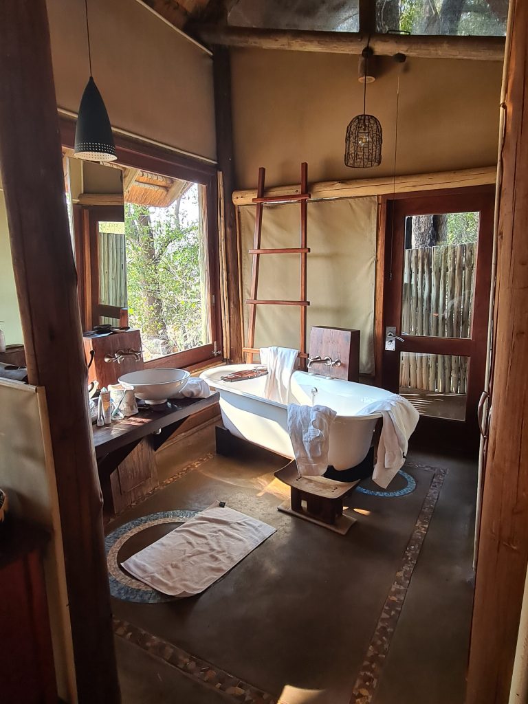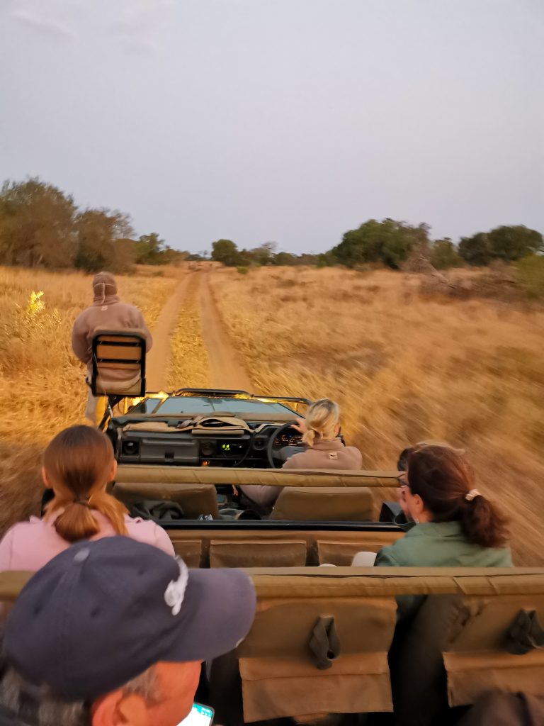 Um 15:30 Uhr geht es los, zunächst starten nur wir zwei alleine im Safariwagen, dann kehren wir nochmals zurück und holen zwei weitere Gäste ab — eine junge, ständig quasselnde Frau samt Partner. Mit Leopardenjäckchen, drei Zentimeter langen Fingernägeln und superauffälligen Augenbrauen stellt sich als Influencerin aus Sabie vor und schafft es doch fast durchgängig in ihr Handy ihre Beiträge für ihre Follower zu produzieren. Den geplanten Teil mit ihren German Friends, womit wir natürlich gemeint sind, verweigern wir relativ entschieden. Aus dem erhofften, friedlichen Na-turerlebnis – auch weil wir kaum Tiere zu Gesicht bekommen – wird nichts. Gegen 19 Uhr sind wir wieder in der Lodge, wo wir mit einem gereichten warmen Frischetüchchen samt Gläschen Amarula empfangen werden. Das Dinner – eine Blumenkohlsuppe, ein Steak vom Strauß, eine Lemonkuchen und eine Birne mit Kaffeesauce – können wir „distanziert von ihr“ wieder genießen. Das Personal trägt seinen Teil dazu bei, ist sehr aufmerksam, freundlich und zu kleinen Späßen bereit. Kurz nach 20 Uhr sind wir wieder in unserem Zimmer, wobei wir auf dem Weg vom Restaurant von einem jungen Mann „eskortiert“ wurden.