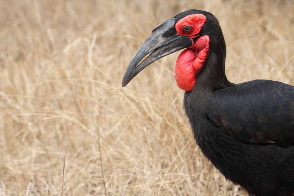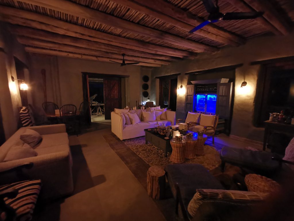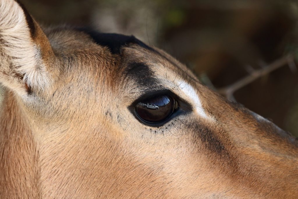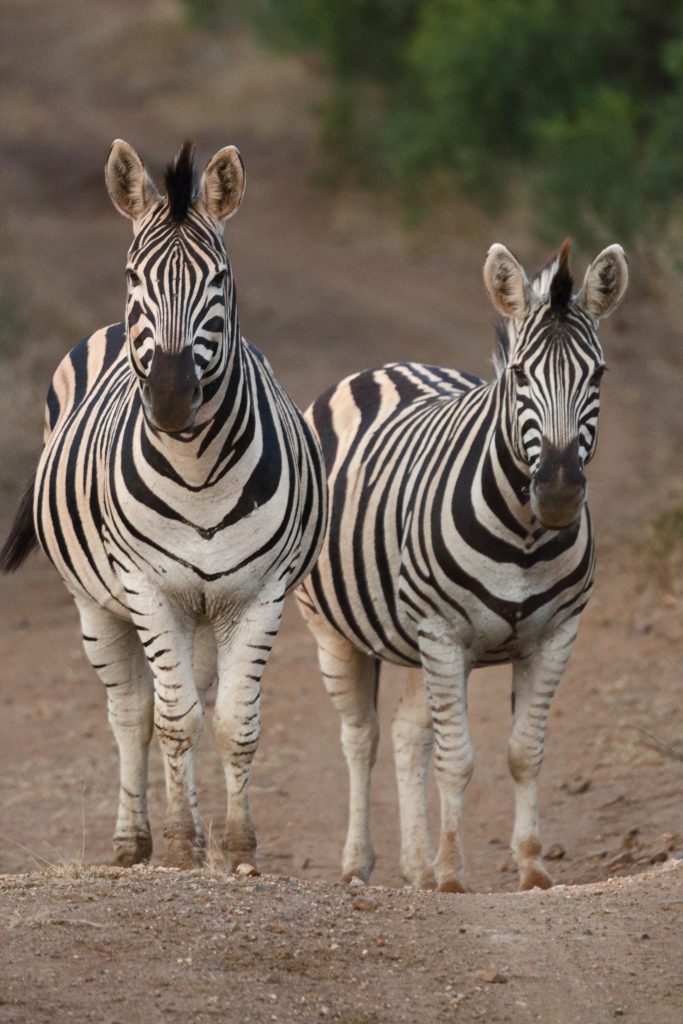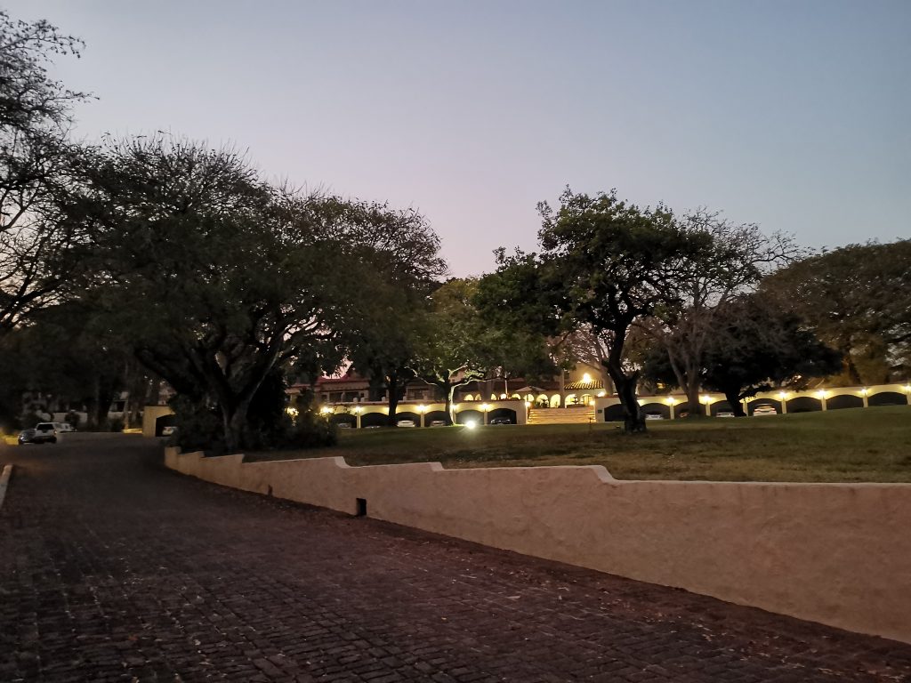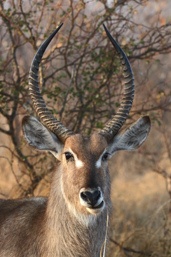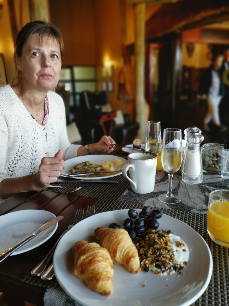 Um 15:30 Uhr geht es los, zunächst starten nur wir zwei alleine im Safariwagen, dann kehren wir nochmals zurück und holen zwei weitere Gäste ab — eine junge, ständig quasselnde Frau samt Partner. Mit Leopardenjäckchen, drei Zentimeter langen Fingernägeln und superauffälligen Augenbrauen stellt sich als Influencerin aus Sabie vor und schafft es doch fast durchgängig in ihr Handy ihre Beiträge für ihre Follower zu produzieren. Den geplanten Teil mit ihren German Friends, womit wir natürlich gemeint sind, verweigern wir relativ entschieden. Aus dem erhofften, friedlichen Na-turerlebnis – auch weil wir kaum Tiere zu Gesicht bekommen – wird nichts. Gegen 19 Uhr sind wir wieder in der Lodge, wo wir mit einem gereichten warmen Frischetüchchen samt Gläschen Amarula empfangen werden. Das Dinner – eine Blumenkohlsuppe, ein Steak vom Strauß, eine Lemonkuchen und eine Birne mit Kaffeesauce – können wir „distanziert von ihr“ wieder genießen. Das Personal trägt seinen Teil dazu bei, ist sehr aufmerksam, freundlich und zu kleinen Späßen bereit. Kurz nach 20 Uhr sind wir wieder in unserem Zimmer, wobei wir auf dem Weg vom Restaurant von einem jungen Mann „eskortiert“ wurden.
