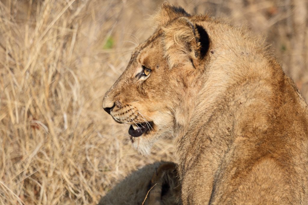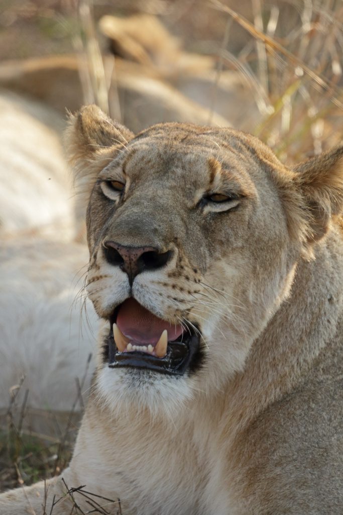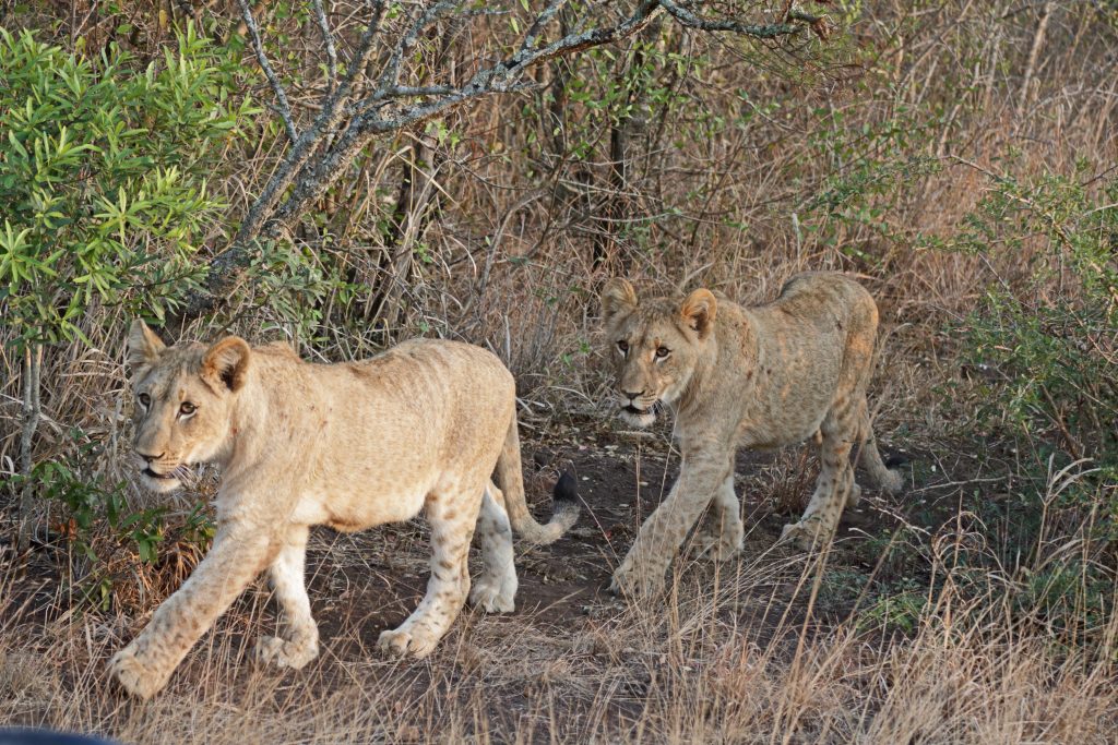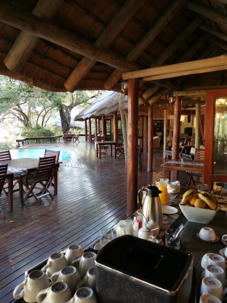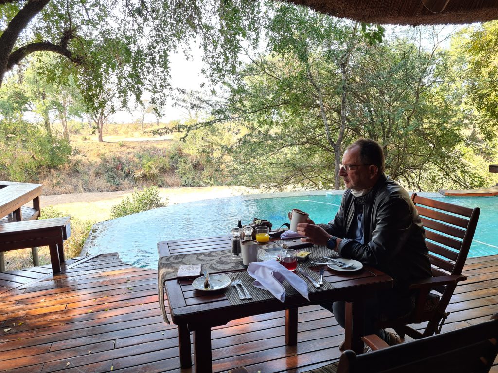 Um 5:15 Uhr klingelt der Wecker, um 5:35 Uhr der Wakeup-Call, um 5:50 Uhr gibt es das short breakfast und um 6 Uhr startet der erste Morgen-Gamedrive samt Influencerin, ihrem ebenfalls ständig telefonierenden Partner und einem weiteren, schwarzen Pärchen, die gestern spät angekommen sind. Die Frau erzählt uns, dass sie schon einmal in München war, sich für Formel 1 interessiert und das Oktoberfest mag, er scheint ein kleiner „Querdenker“ zu sein und berichtet, dass er von den vielen Coronatoten nichts gemerkt habe. Der eigentliche Drive verläuft zunächst eher trist, denn die wilden Tiere scheinen uns zu meiden. Irgendwann stoßen wir dann auf eine krank im Sand einsam daliegende Löwin mit verletztem Nacken, die uns — obwohl wir von ihr nur 3 Meter entfernt sind – nicht beachtet. Dann geht es wahrlich über Stock und Stein, die dornigen Büsche „schlagen“ ins Autoinnere und wir treffen auf ein großes Löwenrudel mit herumspielenden Babies, zwei oder drei älteren Löwenkindern, zwei männlichen ausgewachsenen Löwen und natürlich auch zwei Löwinnen. Wie eine kleine Familie liegen sie träge im trockenen Flussbett, nur die Babies spie-len und tollen herum. Anfangs beobachten wir sie von oben, irgendwann entscheidet sich unser Fahrer ins Flussbett runterzufahren –nun mit freiem Blick auf die ganze Bande. Binnen weniger Minuten explodiert die Anzahl der von uns gemachten Fotos. Als der zweite Imbali-Safariwagen auftaucht, brechen wir unsere Löwenstudien ab. Wir treffen bei der Rückfahrt auf ein paar Elefanten und sind gegen 9:10 Uhr wieder in der Lodge. Dort frühstücken wir ausgiebig. Seit 10 Uhr warten wir nun auf unserer Terrasse auf den zweiten Gamedrive des Tages.