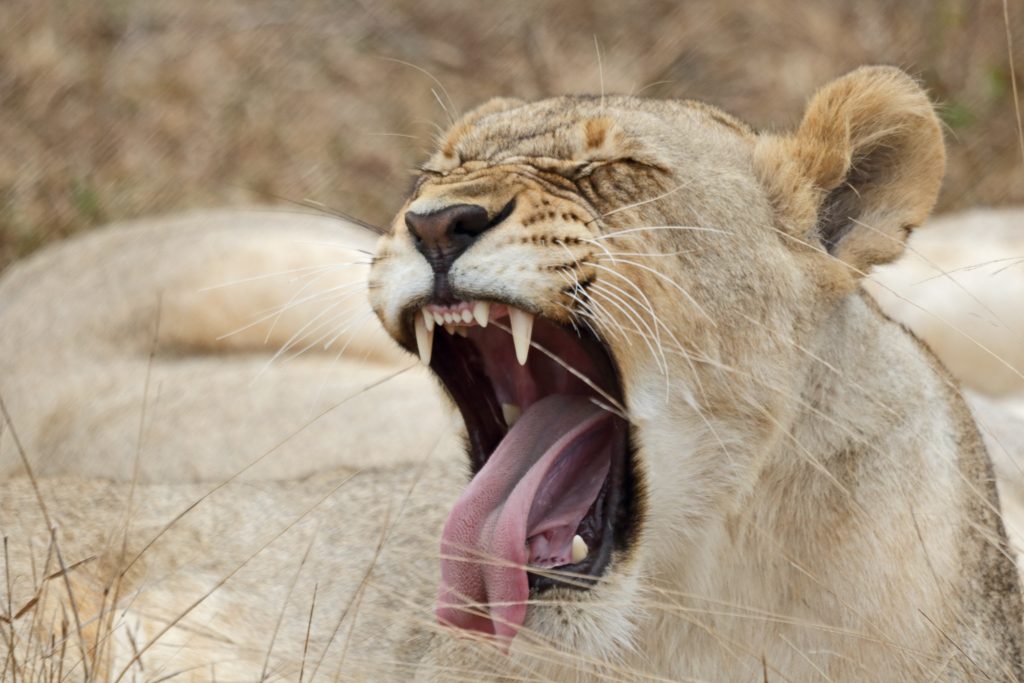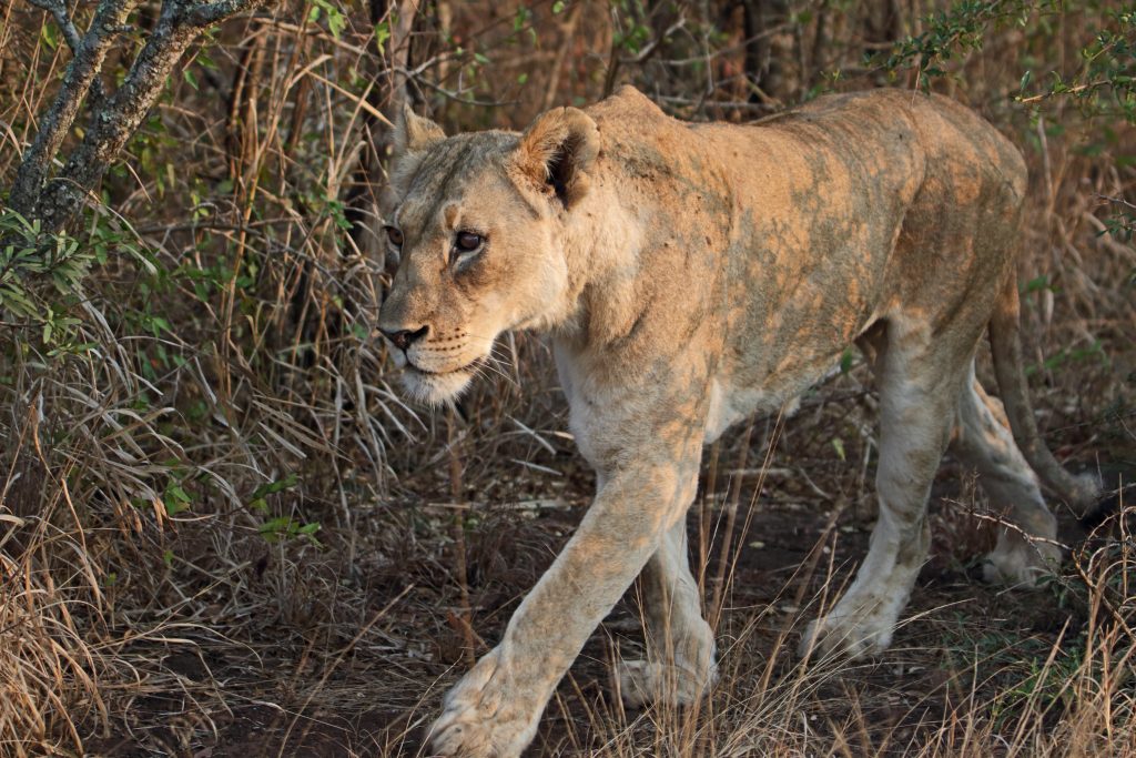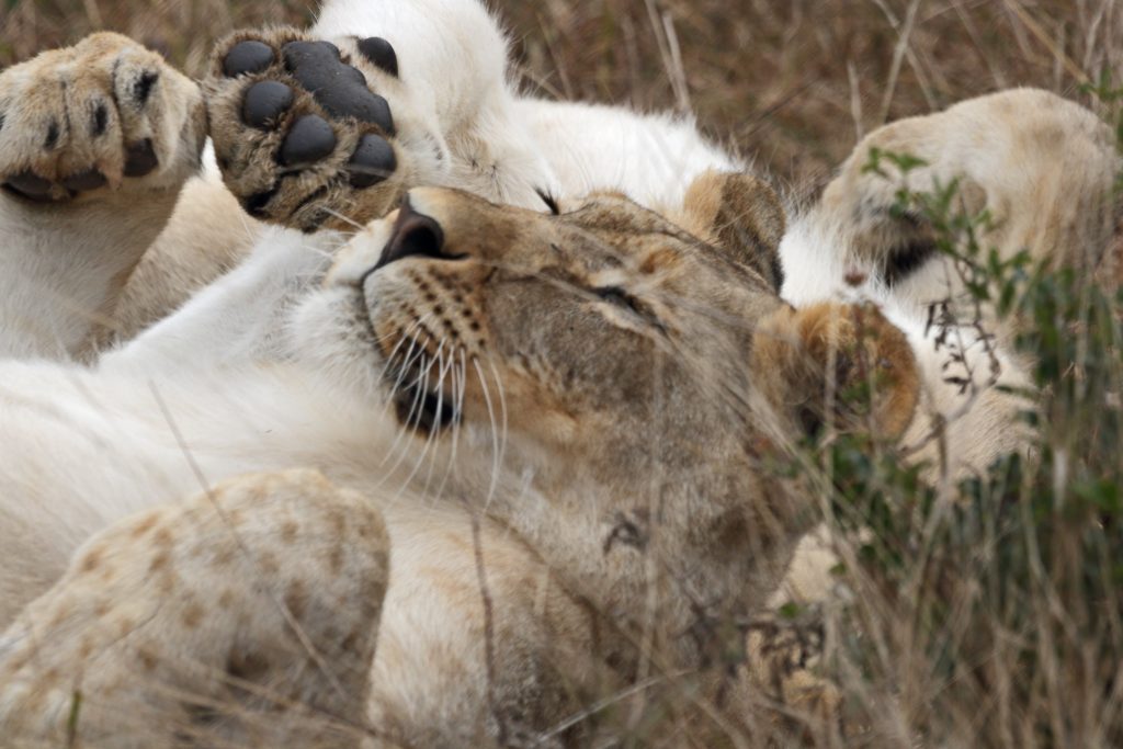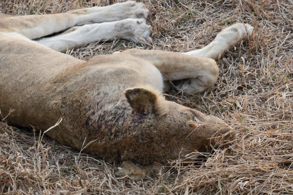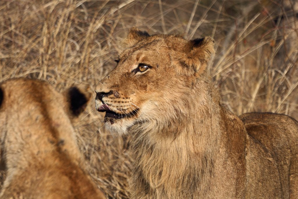 Um 5:15 Uhr klingelt der Wecker, um 5:35 Uhr der Wakeup-Call, um 5:50 Uhr gibt es das short breakfast und um 6 Uhr startet der erste Morgen-Gamedrive samt Influencerin, ihrem ebenfalls ständig telefonierenden Partner und einem weiteren, schwarzen Pärchen, die gestern spät angekommen sind. Die Frau erzählt uns, dass sie schon einmal in München war, sich für Formel 1 interessiert und das Oktoberfest mag, er scheint ein kleiner „Querdenker“ zu sein und berichtet, dass er von den vielen Coronatoten nichts gemerkt habe. Der eigentliche Drive verläuft zunächst eher trist, denn die wilden Tiere scheinen uns zu meiden. Irgendwann stoßen wir dann auf eine krank im Sand einsam daliegende Löwin mit verletztem Nacken, die uns — obwohl wir von ihr nur 3 Meter entfernt sind – nicht beachtet. Dann geht es wahrlich über Stock und Stein, die dornigen Büsche „schlagen“ ins Autoinnere und wir treffen auf ein großes Löwenrudel mit herumspielenden Babies, zwei oder drei älteren Löwenkindern, zwei männlichen ausgewachsenen Löwen und natürlich auch zwei Löwinnen. Wie eine kleine Familie liegen sie träge im trockenen Flussbett, nur die Babies spie-len und tollen herum. Anfangs beobachten wir sie von oben, irgendwann entscheidet sich unser Fahrer ins Flussbett runterzufahren –nun mit freiem Blick auf die ganze Bande. Binnen weniger Minuten explodiert die Anzahl der von uns gemachten Fotos. Als der zweite Imbali-Safariwagen auftaucht, brechen wir unsere Löwenstudien ab. Wir treffen bei der Rückfahrt auf ein paar Elefanten und sind gegen 9:10 Uhr wieder in der Lodge. Dort frühstücken wir ausgiebig. Seit 10 Uhr warten wir nun auf unserer Terrasse auf den zweiten Gamedrive des Tages.