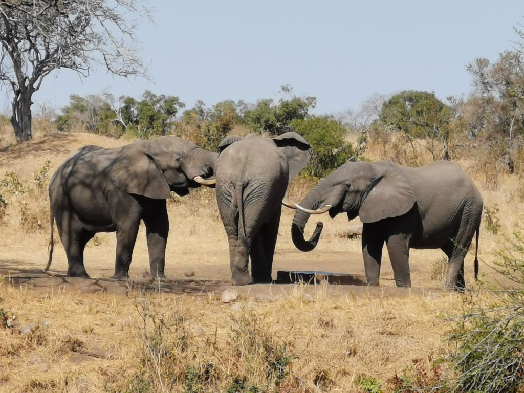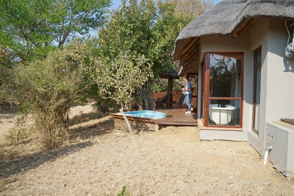 Ein wenig spät, gegen 9:30 Uhr, verlassen wir die erste Lodge und machen uns nach den vier Kilometern unpaved Road über die enge Brücke auf der Teerstraße gen Hazyview. 45 Minuten später „hat“ uns der Kruger Nationalpark. Die Formalitäten sind blitzschnell erledigt und mit zunehmender Entfernung vom Phabenigate steigt die Anzahl der Tiere am Straßenrand. Die ersten Zebras, Antilopen, Elefanten, Büffel und Geier lassen die Vorfreude auf unseren ersten Game Drive in der Imbalilodge steigen. Nach den vielen Fotostopps erreichen wir Imbali später wie angekündigt. Was uns dort erwartet, war uns überhaupt nicht klar, Imbali hatten wir wahrlich nur deshalb gebucht, weil wir nichts anderes in der Gegend gefunden hatten. Diese Lodge erweist sich dann als deutlich legerer als Timamoon und ist vor allem im Bereich der Rezeption und des Restaurants etwas schon in die Jahre gekommen. Unser Häuschen – Nr. 1 – ist allerdings sehr sauber, hat eine große Terrasse mit einem kleinen Pool und eine Klimaanlage, liegt an einem trocken Flussbett, und ist mit einem niedrigen Elektrozaun vor wilden Tieren geschützt. Der erste Eindruck ist positiv, der angesichts des Cappuccinos samt Kuchen vor dem Gamedrive noch anhält, vor allem weil wir dabei noch einen Elefanten bei dem Wasserloch, das auf der anderen Seite des Flussbettes direkt gegenüber des Haupthauses ist, zuschauen können.
