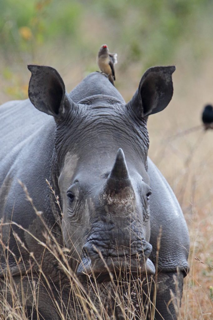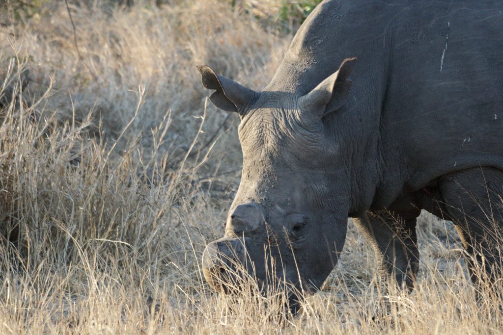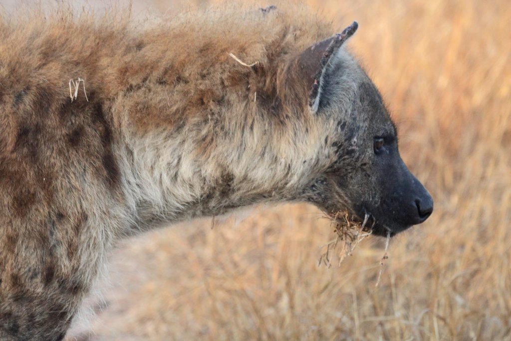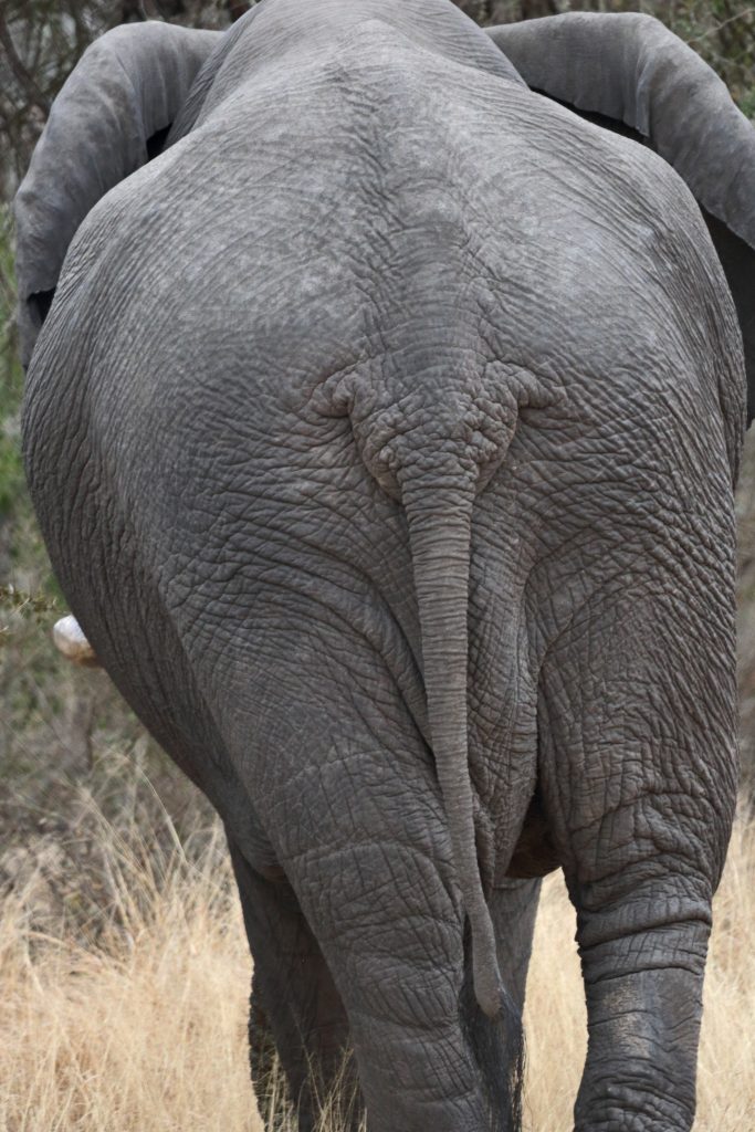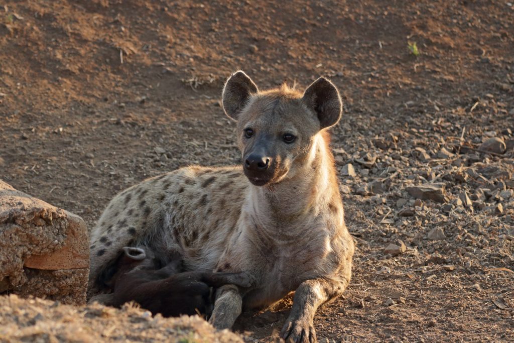 Der Wecker klingelt früh, das Frühstück ist einfach und pünktlich um 6 Uhr stehen wir an der Pforte natürlich ohne vergessen zu haben, unseren Zimmerschlüssel in die Keybox links vor dem Pfortenhäuschen einzuwerfen. Der erste längere Stopp ist eine Hyänenfamily, die ihren Bau unterhalb der Straßen haben. So kommen wir in den Genuss, einem Hyänenbaby beim Säugen hautnah in der ersten Reihe zuzusehen. Außer einem 100 m entfernten Löwen — leider damit zu weit entfernt — und den sonstigen in der Regel sich links und rechts von der Straße sich aufhaltenden Tieren wie Zebras, Giraffen und vielen Antilopen stoßen wir auf keine besonderen Tieren mehr. Die Rhino Post erreichen wir pünktlich nach Zeitplan gegen 13 Uhr bei 35 Grad. Wir bekommen Häuschen Nr. 3, unsere Erinnerungen an vor zwei Jahren werden sofort wieder präsent. Ein Elefant im Flussbett macht uns kurz seine Aufwartung. Um 15 Uhr gibt es High Tea, eine halbe Stunde später startet der Abendgamedrive. James, unser Führer, ist für uns zehnmal leichter verständlicher als beispielsweise Kaizer, er spricht einfach langsamer. Hinzu kommt, dass die anderen Gäste im Safariwagen auch Deutsche sind. Die Fragen und Erklärungen vollziehen sich also nicht in englischem Stakattokauderwelschenglisch, sondern basieren eher auf Brokenenglisch, was für uns einfach verständlicher ist. Leider gibt es aber auch kaum Tierbegegnungen, die der Erwähnung wert wären.