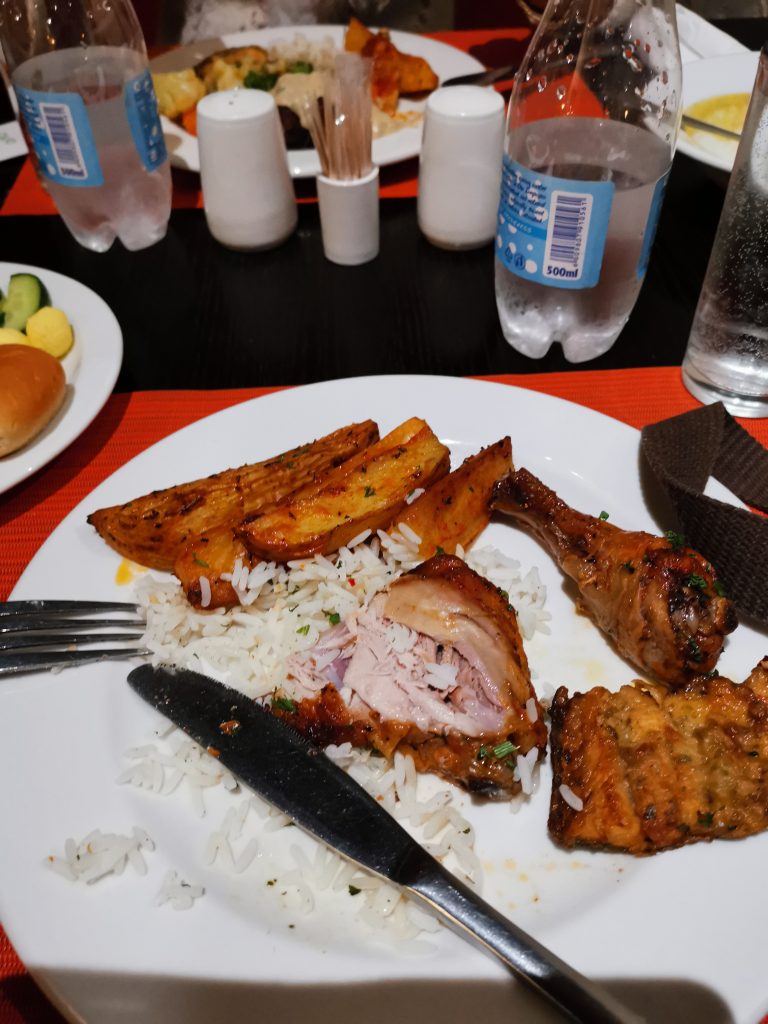 Das Essen ist ein Buffet auf Anweisung hinter Glas. Alles wirkt etwas wie Fastfood und genauso lang ist unser Zeitbedarf. Nach einer halben Stunde sind wir schon wieder auf dem Weg zum Zimmer. Erfreulich ist, dass das Breakfastpaket wir morgen Früh um 6 Uhr abholen können.