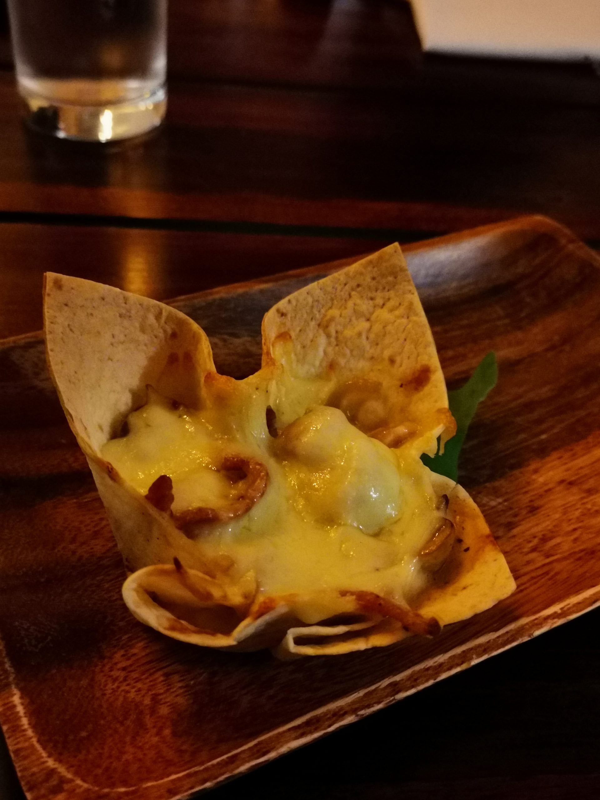 Um 7:30 Uhr gibt es das Dinner drinnen, wohl aufgrund des aufkommenden Windes. Es ist recht gut, die Vorspeise ist eine in einem essbaren Teigchip mit Käse überbackene Köstlichkeit, dann gibt es Hühnerfleisch, das wie eine Roulade auf Kartoffelbrei mit Minizucchini angerichtet ist und als Dessert eine sehr süß schmeckende Nusskreation.