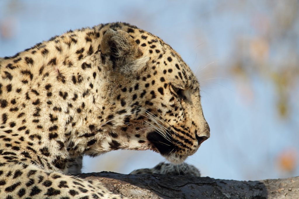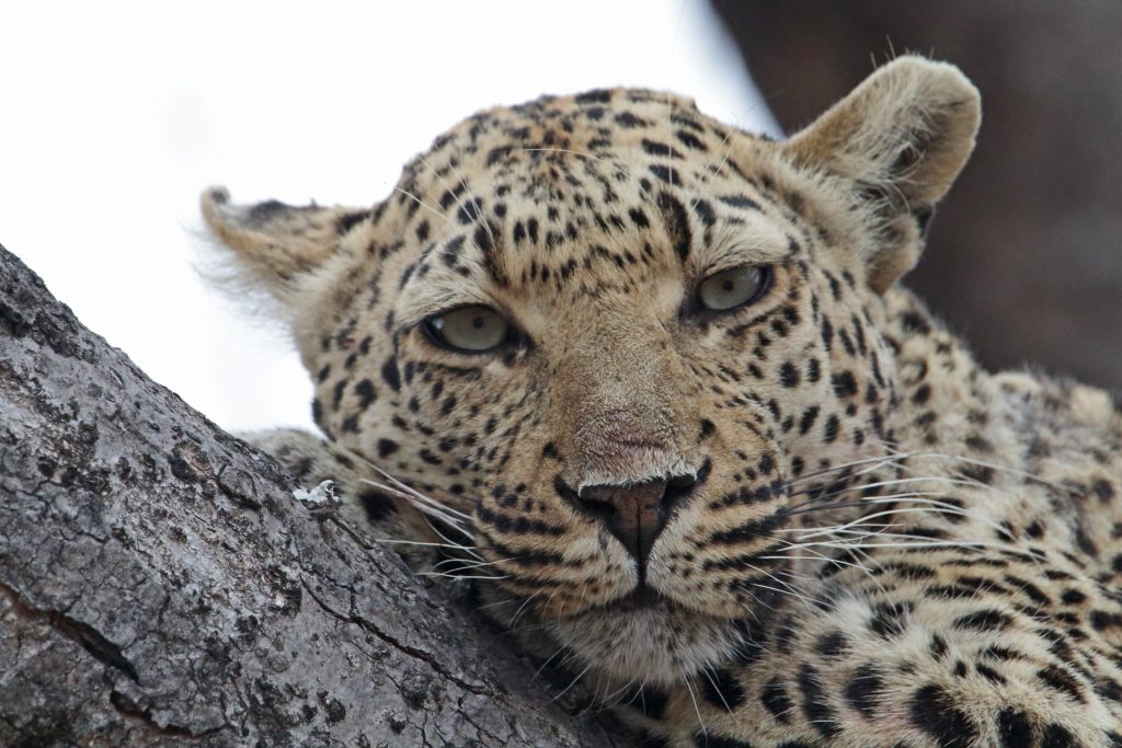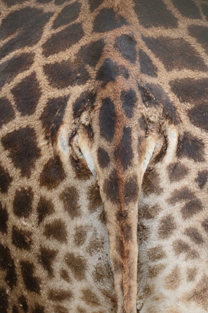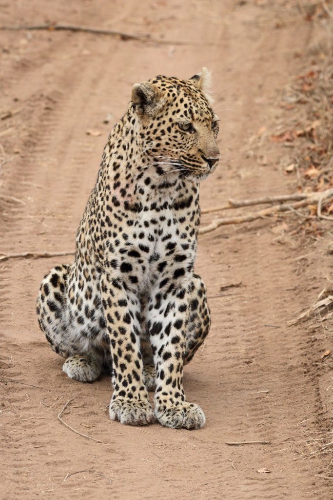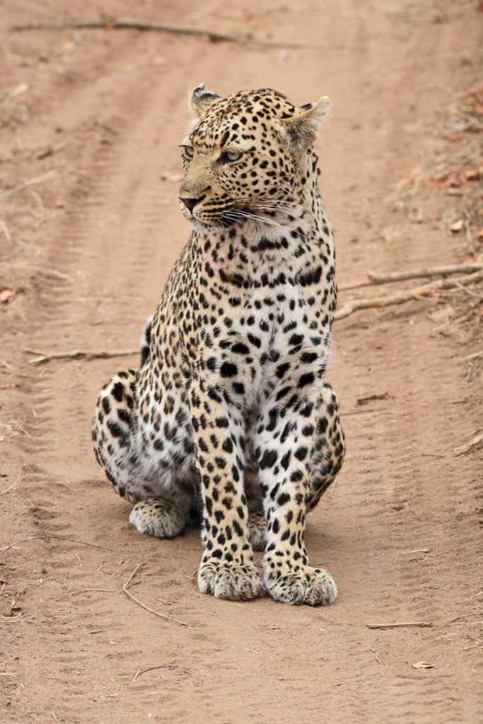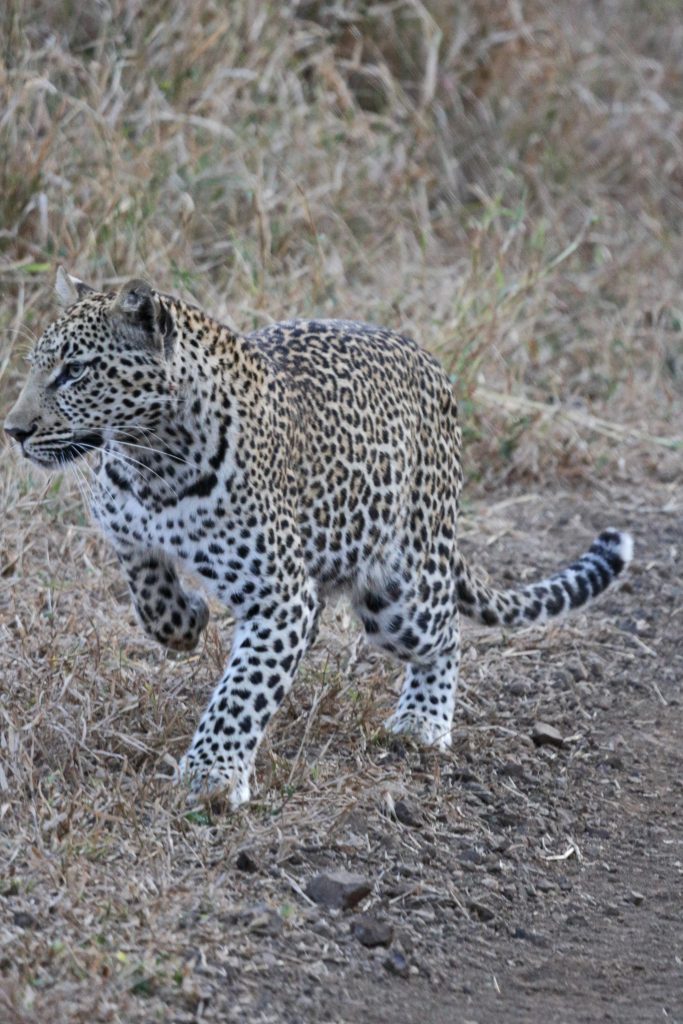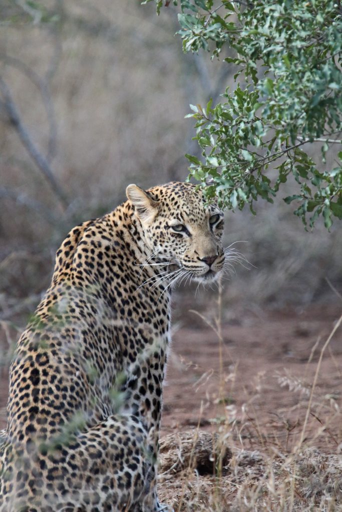 Wir werden schon vor dem eigenen Wecker ans Aufstehen erinnert, nach dem Kurzfrühstück startet unser Morgengamedrive. Er verläuft äußerst fade, die paar Giraffen und die Büffelherde vom Vortag beeindrucken uns nicht besonders. Erst zum Schluss hin wird es aufregend: Wir stehen unter einer Leopardin auf einem Baum und der über ihr ebenfalls auf einem Ast hängenden Antilope als ihre Beute. Vielleicht 5 Meter vom Baum entfernt beobachtet eine hinkende Hyäne das Spektakel. Irgendwann entscheidet sich Madame Raubkatze ihren Viewpoint zu verlassen und drapiert sich für uns auf dem Sandweg in vielerlei Posen — ideal zum Fotografieren, es macht sicherlich zwei- bis dreihundert Mal „Klick“. Kurze Zeit danach sind wir wieder in der Lodge und begeben uns nach dem Deponieren unseres Fotoequipments im Zimmer zum Frühstücken.