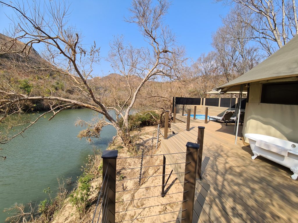 Um 5 Minuten nach 6 Uhr verlassen wir Skukuza in Richtung Manelani-Gate, die „zuverlässigen“ Tierchen — Elefanten und Hyänen — bleiben uns auch heute treu. Um kurz nach 10 Uhr heißt es „Goodbye Kruger“, wir steuern die Ngomazi Game Lodge an. Nach knapp 2 Stunden erreichen wir deren Gate, die restlichen 8 km, für die man ein Highclearance-Fahrzeug haben soll, stellen unseren Hilux vor keine Probleme, nicht einmal in den Allrad müssen wir schalten. Vor der Rezeption steht das Empfangskomitee Spalier. Man schnappt sich unseren Autoschlüssel und zeigt uns die Anlage samt Restaurant und Boma. Alles wirkt höchst professionell und für uns überraschend luxuriös, zuletzt werden wir unsere Zeltvilla mit Nummer 2 geführt. Der Eindruck, den wir schon vom Empfangsbereich erhalten hatten, verstärkt sich hier nochmals: freier Blick auf den Fluss, Außenpool, Außenbadewanne, Außendusche — alles ist perfekt. Das Internet funktioniert — wir sind positiv überrascht. Um 14:20 Uhr gehen wir hoch zum Lunch, zwar dauert unser Essen, aber es schmeckt uns sehr. Nichtsdestotrotz fühlen wir uns fremd — a little bit too professionell and it appears heartless without the special sense for each detail. Der Gamedrive verläuft genauso, über den Gepard vor unserer Nase mit Trackinghalsband freuen wir uns doch. Besagter zeigt uns dann deutlich, dass unser Hauspuma doch eng mit den Raubkatzen verwandt sein muss. Er gähnt auffällig, zeigt uns seine Beißerchen und räkelt sich wie eine verschmuste Hauskatze à la Berti. Mit an Board sind zwei südafrikanische Pärchen, eines weiß und das andere schwarz, wobei von letzterem das ständige Herumspielen mit dem Handy von ihm und die überlangen Fingernägel samt orange-rosafarbenem „Strampelanzug“ trotz Rettungsringen um den Bauch von ihr in Erinnerung bleiben. Abends wird in der Boma gegrillt, wir sitzen alleine, nahe am Feuer, frieren nicht und das Essen schmeckt uns. Den Verzicht auf den Morninggamedrive und unseren Wunsch nach einem früheren Frühstück mit Vorbestellung in der Bar leiten wir noch in die Wege.