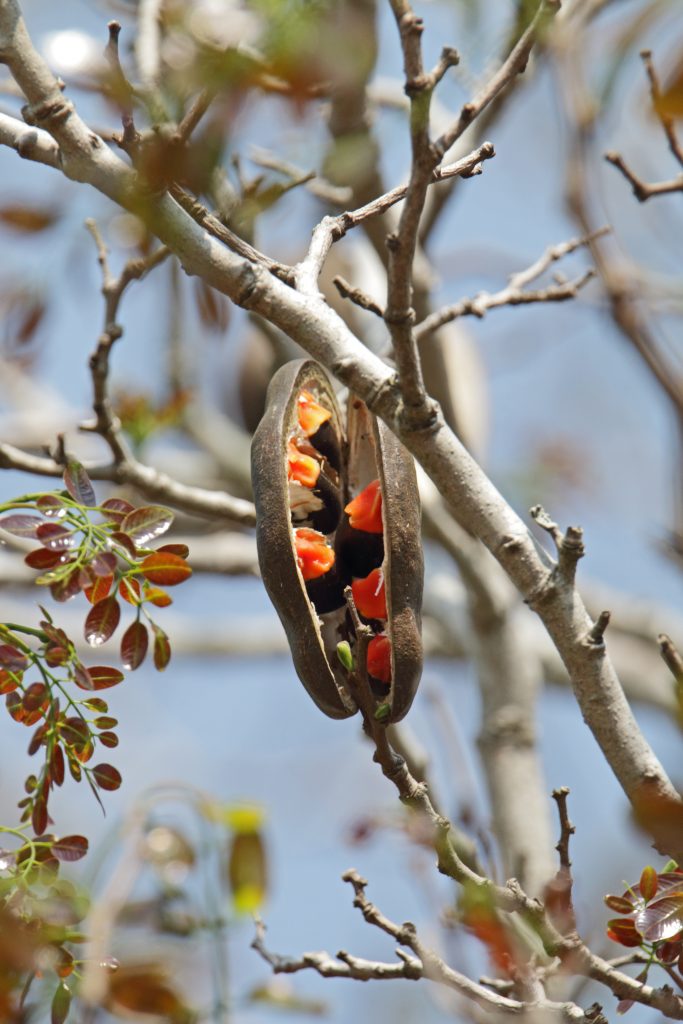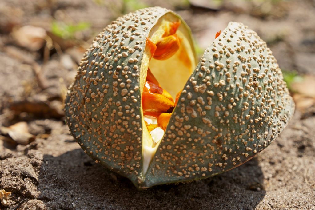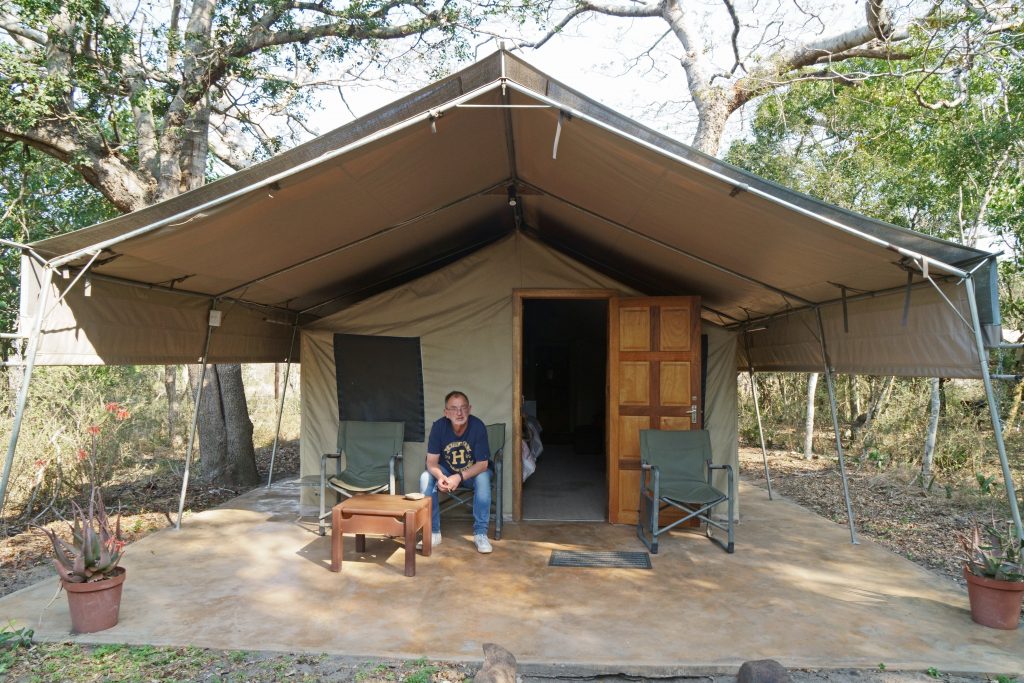 Nach dem akzeptablen Kurzfrühstück setzt sich auf dem Morninggamedrive die Präferenz auf Fluggetier fort. Die Altengruppe, mit denen wir das Safarifahrzeug teilen, ist wenigstens nett — ein Südafrikaner, der sein Berufsleben in den Staaten verbracht hat, erzählt uns viel von seinem zukünftigen Leben mit Frau hier wieder in der Heimat. Außerdem schafft es unser Guide doch glattweg, uns zwei Elefanten zu zeigen. Nun sitzen wir vor unserem Zelt und warten auf das Nachmittagsprogramm. Um 14 Uhr soll es Lunch geben und um 15 Uhr wäre wieder der Rentnertreff im Safariwagen angesagt. Ob uns wieder Fluggetier gezeigt wird, steht noch in den Sternen. Dass wir Löwen bevorzugen, haben wir auf jeden Fall oftmals genug geäußert. Unser Vogelführer liebt es übrigens, seine Anmerkungen und Erklärungen mit einem nachgestellten, langgedehntem „Jaaaaaa“ nachdrücklich abzuschließen. Außerdem suchen wir noch fortwährend nach der „Kugelfrucht“, die wir 2019 als Souvenir mit nach Hause gebracht hatten — eine Kugel haben wir schon ergattert, gefunden wenige Meter von unserem Zelt an einem stachligen Baum hängend. Es bleibt tatsächlich dabei, dass unser Aufenthalt hier unter keinem guten Stern steht, denn auch der zweite Abendgamedrive bietet nichts an erwähnenswertem Getier. Dafür steigt die Misslaune über unseren Aufenthalt hier incl. dem Führer, der sich u. E. auch keine Mühe gibt, Löwen oder Elefanten zu finden. Neu für uns war das zweistöckige Beobachtungshäuschen mit Blick auf das Wasserloch, das per Webcam sowohl im Internet als auch im Restaurantbereich auf dem Flatscreen hinter Bar beobachtet werden kann. Das Abendessen passt sich der Laune an, das Kudufleisch ist zäh, nur der Reis schmeckt.