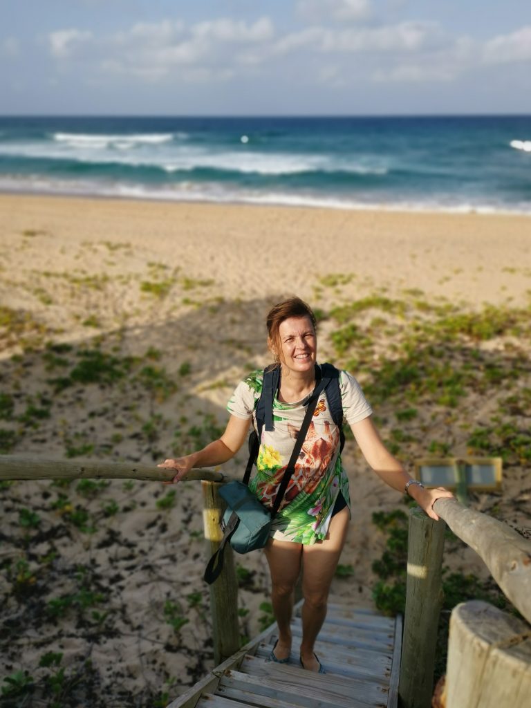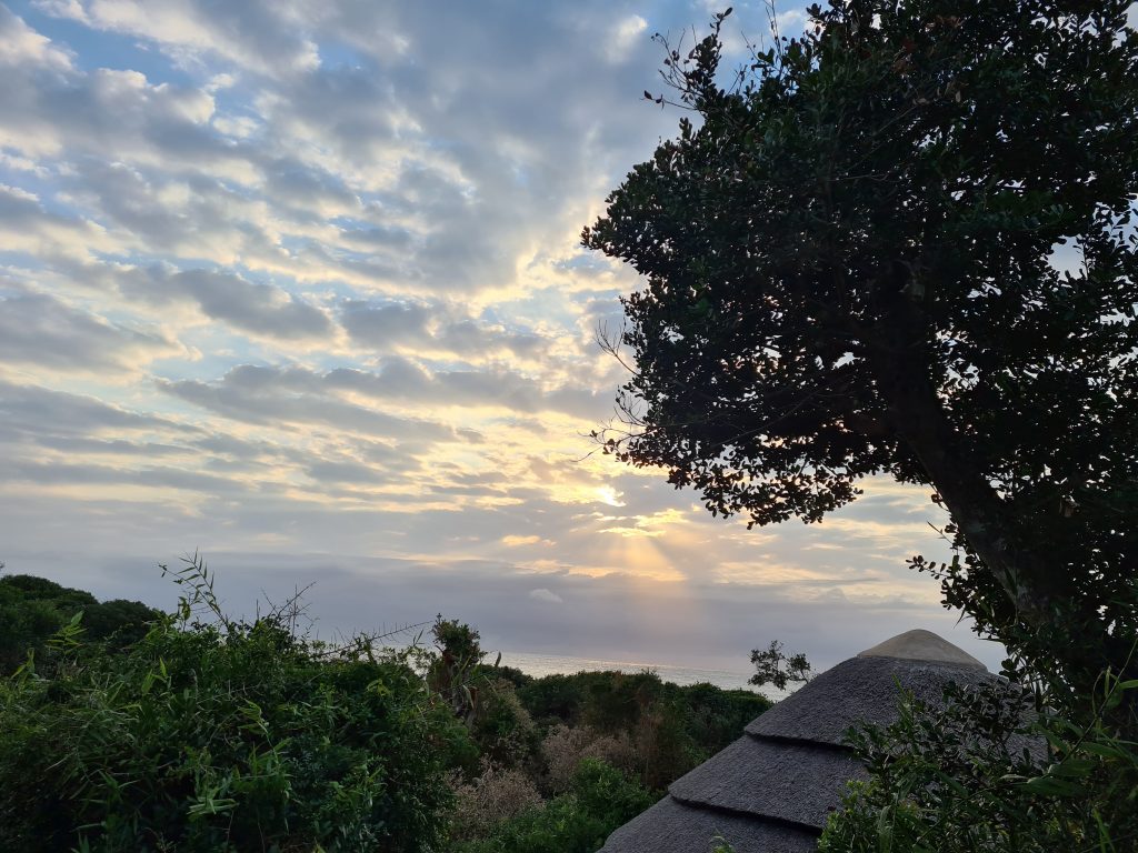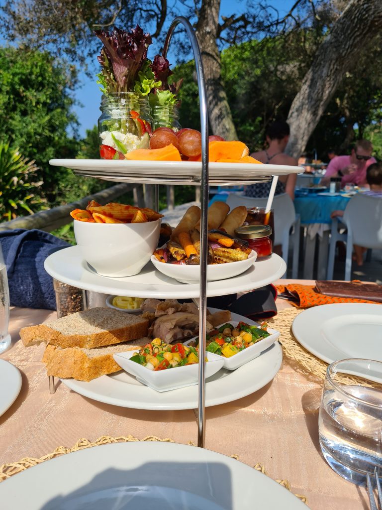 Thonga empfängt uns gegen 12:20 Uhr really smart — die Anfahrt hat Spaß gemacht, die Sonne scheint, die Erinnerungen werden wach und das Empfangsmädel ist freundlich und lustig. Wir bekommen die bescheidene „Hütte“ 9 mit Mehrblick, etwas höher gelegen als die, die wir vor zwei Jahren hatten. Der Lunch um 13 Uhr wird in einer High-Tea-Etagère gebracht und schmeckt wirklich vorzüglich. Dann düsen wir erstmals in Badekleidung „kurzbehost“ gen Beach und marschieren wie vor zwei Jahren in die gleiche Richtung. Trotz Lunch lassen wir uns den Kaffee samt Kuchen nicht entgehen. Dann geht es stressfrei ohne Ärger über No-Animal-Some Birds-Watching-Tours zurück ins Zimmer, wir duschen, genießen den Luxus und hören dem Meeresrauschen zu. Leider bewölkt es nun immer mehr — das von uns für morgen gebuchte „Ocean Adventure“ scheint gegebenenfalls wie vor zwei Jahren ins Wasser zu fallen. Was tatsächlich kleinkariert und negativ zu sehen ist, ist die Limitierung des Internets angesichts des hier zu zahlenden Zimmerpreises. Um 19 Uhr gibt es das Dinner — wir sind gespannt, wie dieses unter Coronaregeln innen ablaufen wird. Es gibt Fisch mit Nudeln und verläuft relativ pandemiekonform, denn einige Tische wurden anscheinend im 1. Stock gedeckt. Am Nachbartisch sitzt die von uns recht „altbacken“ eingeschätzte Erlanger Familie, mit denen wir in der Rhino Post schon einige Gamedrives miteinander gemacht hatten — während des Eincheckens hier in Thonga war uns die Frau kurz begegnet, ihn hatten wir mit Sonnenhütchen ebenfalls schon kurz gesehen.