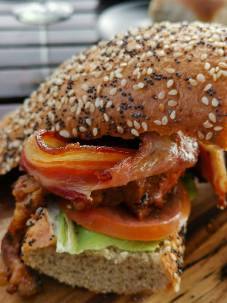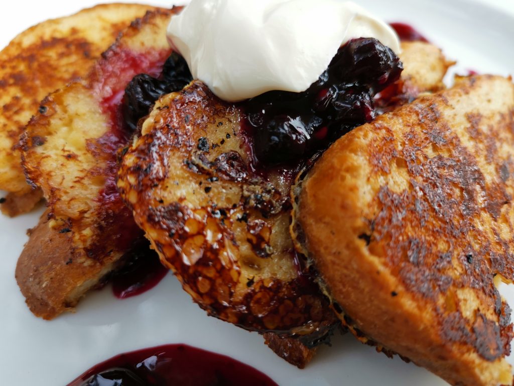 Nach Außendusche mit warmem Wasser „klappt“ unser Frühstück perfekt — auch wenn unser French Toast mit Bacon und Mango eher nach Toast Hawaii schmeckt als der erhofft rein süße Toast so, …