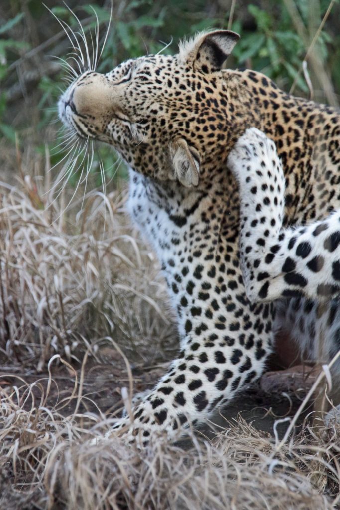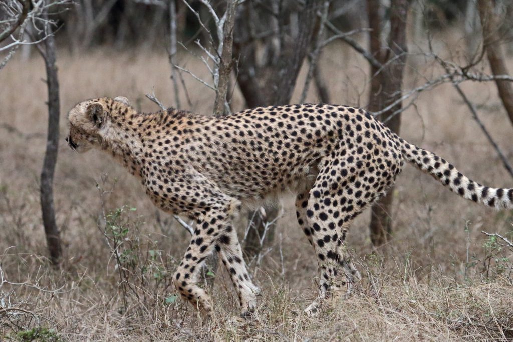 Der Tag beginnt mit dem georderten PCR-Spucktest, gefolgt von unserem zimmerinternen Precoffee, der schon zur Gewohnheit wird. Leider ist der Himmel ist recht bewölkt. Der Morninggamedrive beginnt um kurz nach 6 Uhr, es sind nun nur noch vier Teilnehmer, denn das Mutter-Tochter-Gespann reist anscheinend früh ab. Frieren tun wir ausnahmsweise nicht, denn wir erhalten eine Wärmflasche. Kim macht so phänomenal weiter, wie wir sie gestern erlebt haben: die spielende Gepardenfamilie mit Mutter und zwei Halbstarken, dann der Regen, dem wir im Poncho zu trotzen versuchen und dann wieder unsere lazy lions vom Vortag. Zurück in der Lodge gehen wir zum Frühstück, den Lunch, den wir uns aufs Zimmer haben bringen lassen, verschmähen wir großteils. Der Abendgamedrive wird private: Kim, der Tracker und wir. Es beginnt mit dem Elefanten direkt bei unseren lazy lions, es folgen die drei noch jugendlichen, verspielten und neugierigen Hyänen bei ihrem Bau und endet bei den ebenfalls noch jugendlichen Leoparden. Leider ist es zu diesem Zeitpunkt schon so dunkel, dass wir nicht mehr fotografieren können. Beide waren anscheinend seit 3 Monaten nicht mehr gesehen worden.