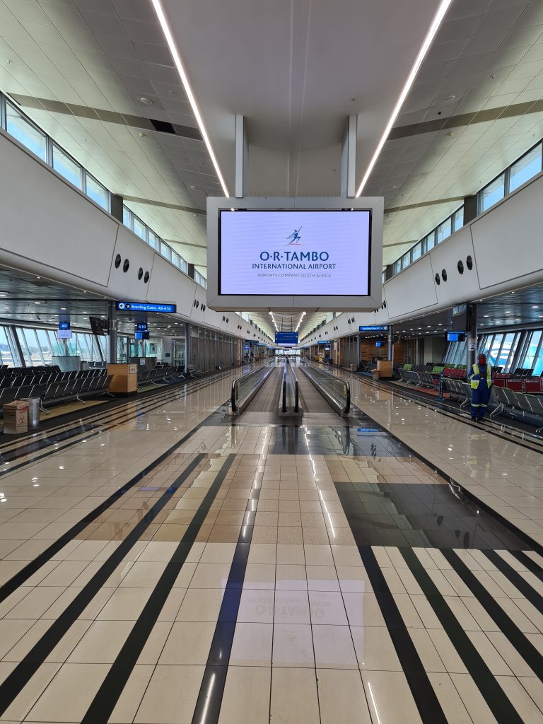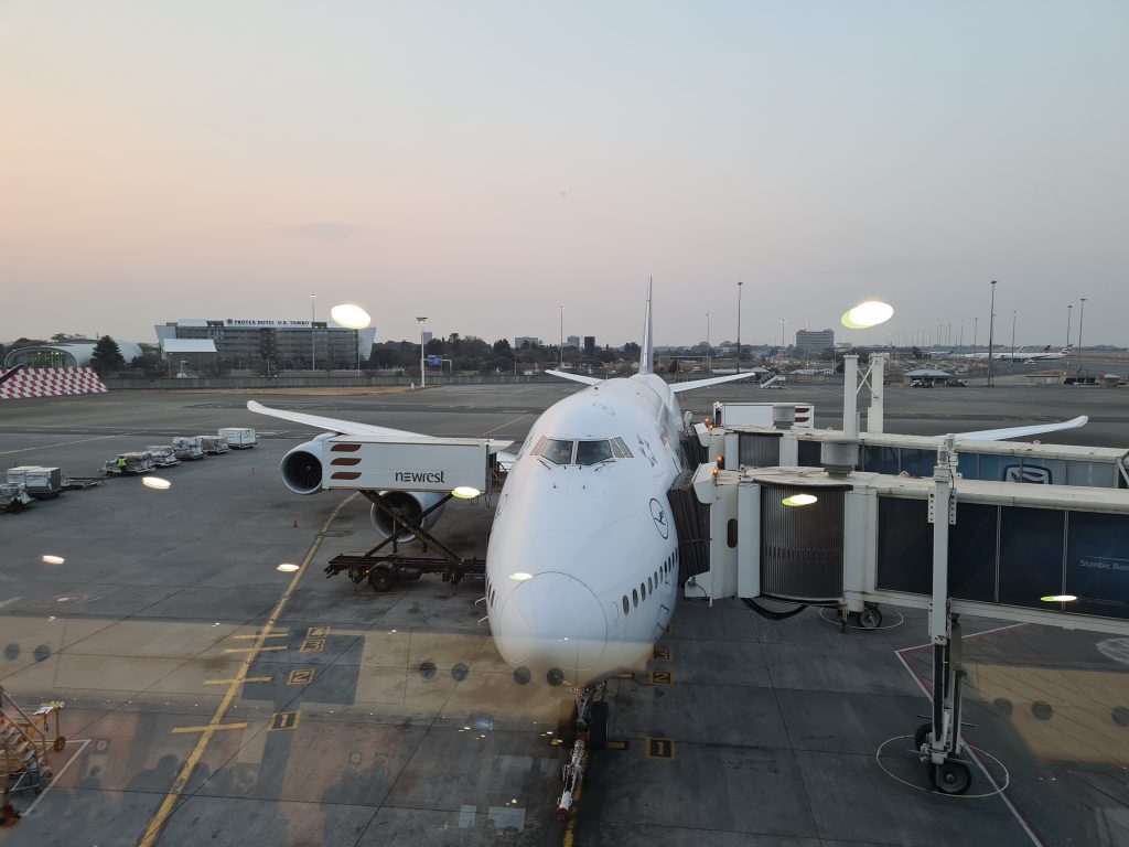 Unser letzter Urlaubstag: Es gibt es ein kleines warmes Frühstück – ausreichend, aber nicht zu vergleichen mit Phinda. Ohne Stopp geht es zum Flughafen, um ca. 14 Uhr sind wir bei Europcar. Die Rückgabe ist schnell erledigt. Es gibt zwar keinen Rückgabebeleg, aber nach kurzer Zeit erhalten wir eine Bestätigung per SMS. Im internationalen Terminal ist fast nichts los, die Halle mit den Check-In-Schaltern ist nahezu ausgestorben. Sie öffnen erst 3 Stunden vor Abflug – alle Ein- und Ausgänge sind geschlossen. Außerdem kann man nur an wenigen Punkten das Gebäude verlassen oder betreten. Beim Einchecken werden dann das Einreiseformular und unser Impfnachweis nochmals genau kontrolliert bzw. müssen wir noch ein Formular ausfüllen, das vor der Grenzkontrolle eingesammelt wird. Auch bei den Gates ist „tote Hose“, fast alle Geschäfte sind bis auf ein paar Imbisshops geschlossen. Kein Vergleich mit dem letzten Mal! Immerhin ist unser Flieger – eine Boeing747 – schon da, pünktlich geht es dann los gen Frankfurt.