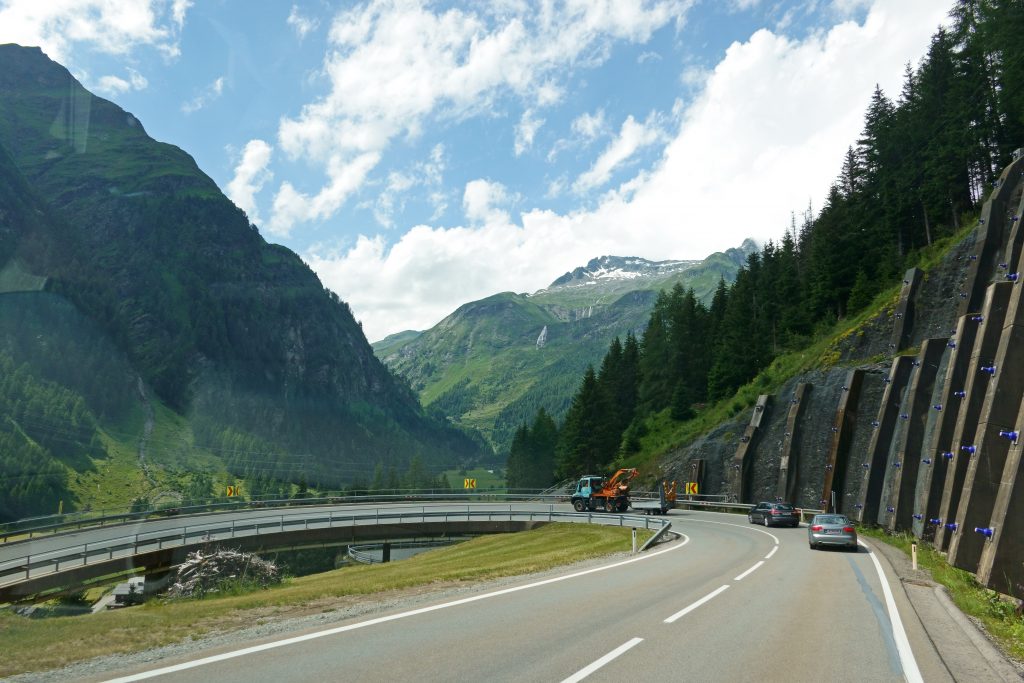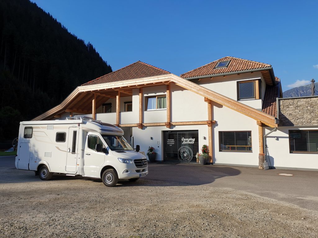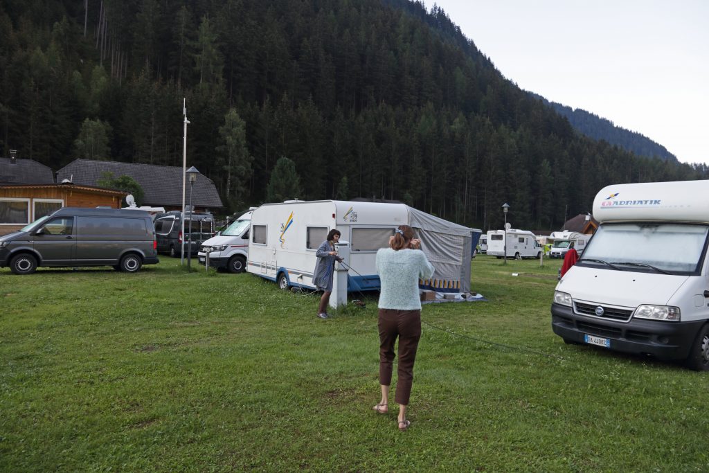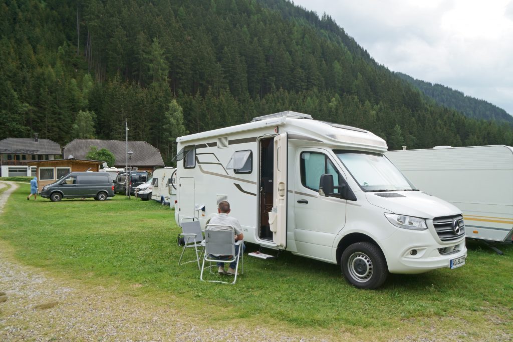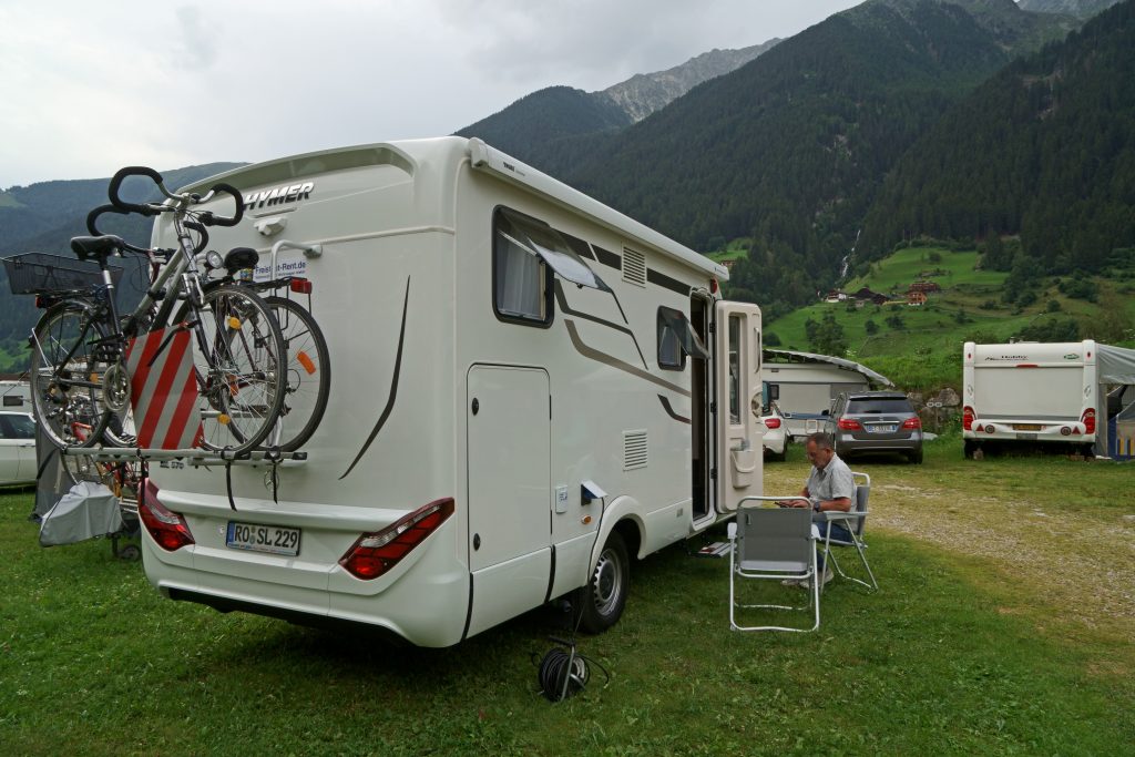 Dann geht es zurück nach Rosenheim. Der Weg zum Real war bis auf die Pfandflaschenabgabe umsonst – wir holen Geld bei der Sparkasse bzw. ein paar Teilchen vom Bäcker und bringen noch schnell den Müll weg. Das Reinmachen führt dann zu familientypischem Trouble. Unwohlsein muss laut Familienchef öffentlich in den Medien bekannt gegeben werden – was fälschlicherweise nicht berichtet wurde. Nach 15 Minuten herrscht aber wieder Frieden, und der Urlaub kann losgehen. Über die Landstraße geht es nach Reit im Winkl, dann in Österreich nach Kitzbühel über den Pass Thurn und den Felbertauerntunnel zum Staller Sattel. Ein Verkehrsschild in einer Baustelle führt zu Trouble Nr. 2. Besagtes Schild kollidiert mit dem rechten Außenspiegel – ein paar Kratzer und ein paar Sprünge im kleinen Rückspiegel sind die Folge. Oben am See erreicht man Italien. Gott sei Dank müssen wir nur fünf Minuten warten, ehe es auf der engen Einbahnstraße nach unten geht. Sie ist zwar recht eng, aber wir schaffen es glattweg, den zweiten Spiegel nicht zu beschädigen. Der Campingplatz in Antholz ist schnell erreicht. Der Platz, den wir hier bekommen, ist aber nicht das Gelbe vom Ei. Im Grunde sind wir von allen Seiten von anderen Campern umgeben – Campingromantik kann hier nicht aufkommen. Erfreuliches gibt es dennoch: Das WLAN funktioniert, und die Stromdame war freundlich und sprach Deutsch. Jetzt sitzen wir auf unseren Stühlen vor unserem Wohnmobil und lauschen der Kommunikation unserer italienischen Campnachbarn. Das Wetter ist übrigens okay – bewölkt und leicht schwül.
