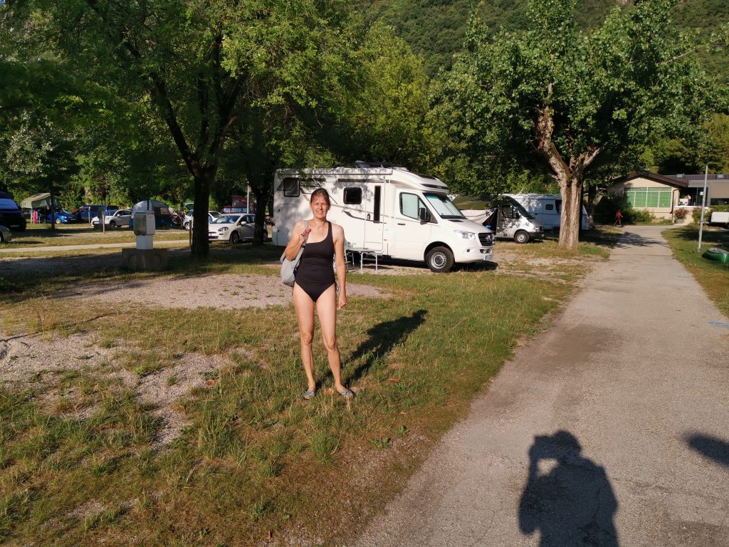 Frühstücken, Badengehen – so beginnt der Tag. Das geplante Vorhaben, mit dem Rad nach Kaltern, Sankt Michael und Sankt Pauls zu fahren, wird zwar nicht zum Albtraum, endet aber aufgrund des ständigen Auf und Abs schon in Kaltern. Nahezu bei jeder Steigung müssen wir unsere Zweiräder schieben, und die Begeisterung für die umgebenden Weinberge und Obstbäume leidet deutlich darunter. Irgendwie ist uns das Radfahren wohl nicht in die Wiege gelegt worden. Die drei Cafés in Kaltern hauen uns auch nicht vom Hocker. Deshalb drehen wir um und machen uns vorzeitig wieder auf den Weg zurück zum Lago di Caldaro. Allerdings fahren wir noch eine Runde um den See – hier verlaufen die Wege relativ eben und sind auch für uns Amateurradler ohne elektrische Unterstützung machbar. Mittags sind wir wieder bei unserem Gefährt mit den vier Reifen, und wir stellen unsere Räder unverzüglich auf den Ständer. Mit Internetsurfen und Lesen verbringen wir – wie ein frühzeitig in Ruhestand gegangenes Ehepaar – die nächsten Stunden gemütlich in unseren Campingstühlen. Das Faulenzen wird nur durch einen Badebesuch am Steg unterbrochen, der allerdings durch ein paar Regentropfen sein Ende findet. Der befürchtete große Schauer bleibt aber aus. Das schnelle Einholen unserer Markise, die wir zuvor erstmals ausgefahren hatten, wäre in dieser Dringlichkeit nicht nötig gewesen. Der Nachmittagskaffee lässt nicht lange auf sich warten, und wir begeben uns wieder dem dolce far niente hin. Heute Abend stehen Einkäufe im Campingplatz-eigenen Shop sowie ein Essen im 3-Sterne-Restaurant – sofern man das so nennen kann – auf dem Programm. Die nächsten fünf Tage sind mehr oder weniger fest geplant: Venezia Fusina mit drei Übernachtungen und Firenze Camping in Town mit zwei. Damit steuern wir auch wieder kulturelle Höhepunkte an – im Gegensatz zu dem, was wir bisher gesehen und erlebt haben. Mal schauen, wie wir diesen inhaltlichen Wandel bewältigen. Beide Plätze haben wir schon von zuhause aus reserviert. Nach Florenz können wir dann nach Lust und Laune weitere Ziele ansteuern oder auch streichen. Abends gehen wir – wie gesagt – zum Essen und leeren anschließend noch den besagten Rubatsch, wobei die Weinqualität deutlich über den des Zwiebelrostbratens liegt.