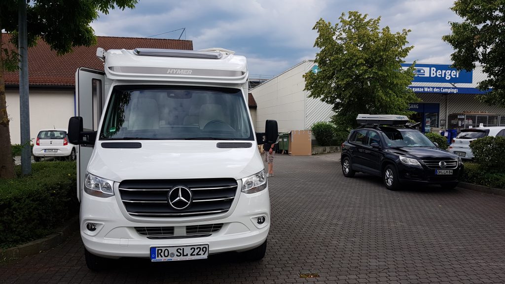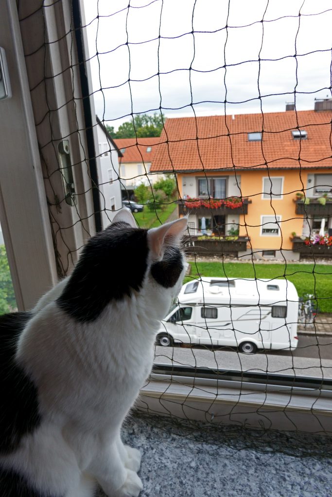 Am Tag zuvor holen wir bei Strempf & Lahm unser Mobil ab. Wir bekommen eine gründliche Einweisung, und unsere Fahrradträger werden auf dem Träger befestigt. Zuhause räumen wir noch fleißig alles Nötige ein. Etliche Male müssen wir rauf- und runterlaufen. Es ist doch eine ganze Menge, was wir mitnehmen wollen. Puma begutachtet von oben unser Gefährt.