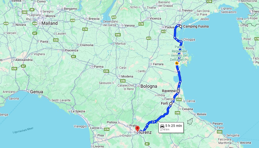 Wir verlassen Venedig mit dem Gefühl, viel gesehen zu haben – und außerdem mit dem Eindruck, beim Campingplatz ein glückliches Händchen gehabt zu haben. Der Service bei der Abreise verläuft problemlos, sogar das Entleeren und Nachfüllen klappen reibungslos. Unsere heutige Route führt von Fusina bei Venedig über Ravenna, dann Forli nach Florenz – etwa 270 Kilometer, komplett ohne Autobahn und leider auch ohne besondere Highlights. Bis Ravenna verläuft die Fahrt recht zügig. Danach geht es über kurvenreiche Bergstrecken, sogar ein Pass ist dabei, was dann länger dauert als erwartet. Die Ankunft auf dem Campingplatz „Firenze Camping in Town“ verläuft zunächst schleppend. Viele Menschen stehen beim Check-in an, man muss sogar eine Nummer ziehen, um überhaupt zum Schalter vorgelassen zu werden. Dann noch Fiebermessen – alles begleitet von laut dröhnender Musik aus den Lautsprechern. Diese beschallt den Platz so sehr, dass wir uns für einen Stellplatz in größerer Entfernung zum Eingang und Poolbereich entscheiden. Die Auswahl ist begrenzt, aber immerhin teilweise einem freigestellt. Unser Platz ist klein und stark abschüssig, sodass wir zum ersten Mal unsere kleinen Auffahrkeile einsetzen müssen. Begeisterung sieht anders aus. Gegen 17:00 Uhr machen wir einen ersten Rundgang, begutachten die Duschen und kaufen das Nötigste im kleinen Campingmarkt ein. Auf dem Hinweg beobachten wir, wie der Shuttlebus nach Florenz ankommt – voll bis auf den letzten Platz. Das bestärkt uns in unserem Plan, morgen mit dem Fahrrad ins Stadtzentrum zu fahren. Ob das eine gute Idee war, wird sich noch zeigen. Jedenfalls verschafft es uns Flexibilität und die Möglichkeit, früh loszufahren.