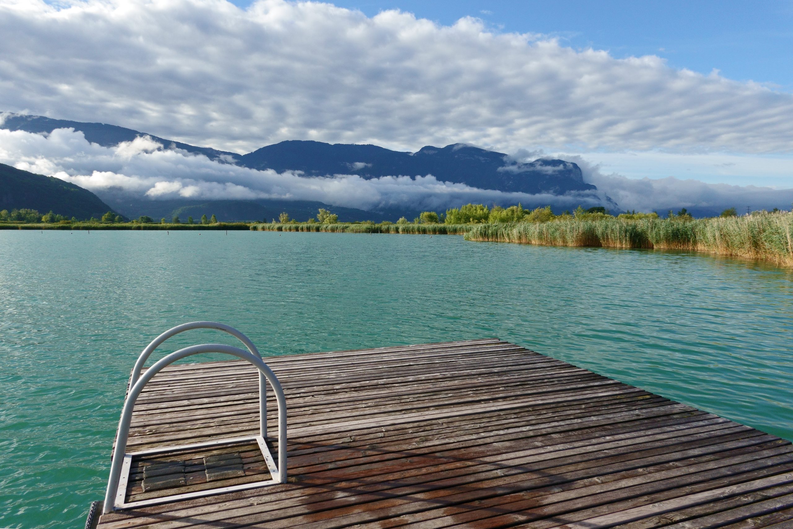 Dann geht es weiter den Zinnen entlang und schon beginnt das nächste Fiasko. Gleich kurz nach der Kreuzung beginnt der Stau, und wie wir von einem anderen Wohnmobilfahrer erfahren, zieht sich der bis oben bis zur Mautstelle. Zwei Stunden im Schneckentempo nach oben zu fahren ist natürlich wenig attraktiv. Beim ersten Kreisel schauen wir um und canceln das Abenteuer Zinnen. Fünf Minuten später parken wir unweit in Missurina, und schon fünf Minuten später werden wir von der Polizei vertrieben. Mit den Zinnen ist unsere Planung für die ersten Tage damit auch gescheitert. Wir entschließen uns über Cortina d’Ampezzo, dem Passo di Falzarego und dem Pordoijoch gegen Abend auf dem Weg zu machen. Dies funktioniert fahrtechnisch problemlos, die Möglichkeit aber mit dem Wohnmobil über Nacht bei Fotostopps zu parken, bleibt uns einfach auch versagt. Wenigstens beim Karersee haben wir Erfolg. Wir parken unbezahlt zu Pkw-Gebühren und umrunden den See. Die Farbe des Sees ist echt toll. Am Abend gibt es eine improvisierte Begegnung zum Abendessen mit den Geschwistern. Die Weiterfahrt zum Kalterer See ist dann ohne Probleme, der Campingplatz ist etwas angenehmer, weil man etwas mehr Platz fürs Fahrzeug hat. Allerdings ist es verdammt heiß – und temperaturtechnisch einfach anstrengender als gestern. Schauen wir mal, wie heiß es im Wohnmobil während der Nacht sein wird. Auf jeden Fall läuft der Ventilator schon … Und weil es so heiß und drückend ist, lassen wir es uns nicht nehmen, vor dem Abendessen einmal ins kalte Nass des Kalterer Sees zu springen. Ein Weg führt direkt vom Campingplatz zu einem kleinen Bootssteg, der vielleicht 25 Meter hinaus reicht, mit einer hölzernen Schwimminsel am Ende. Ein positiver Tagesabschluss!
