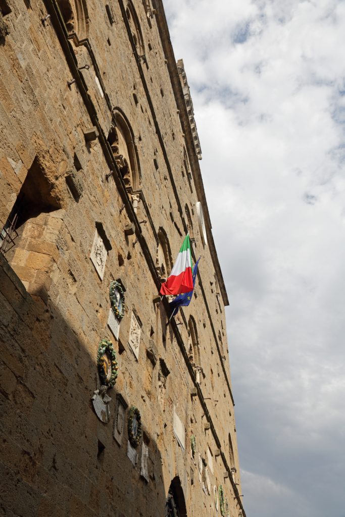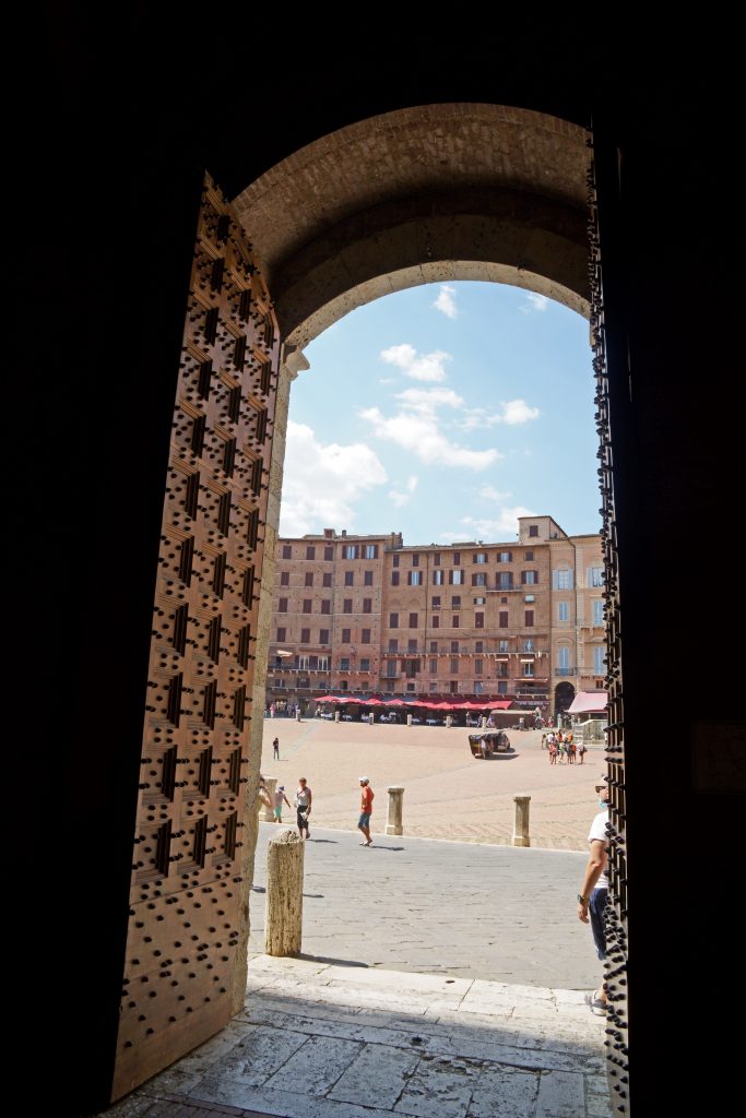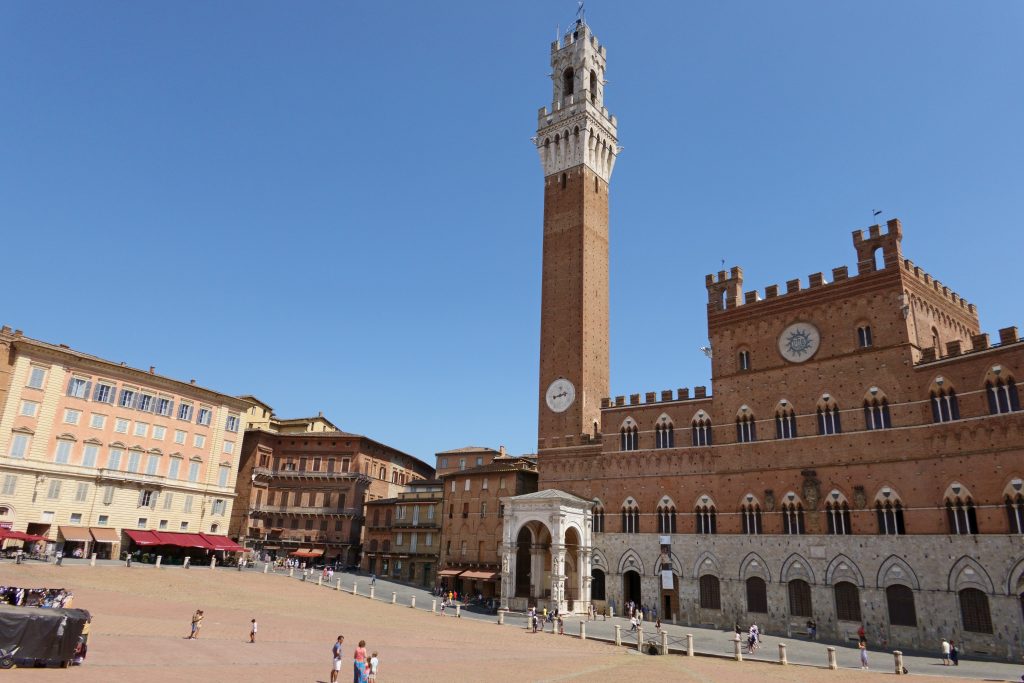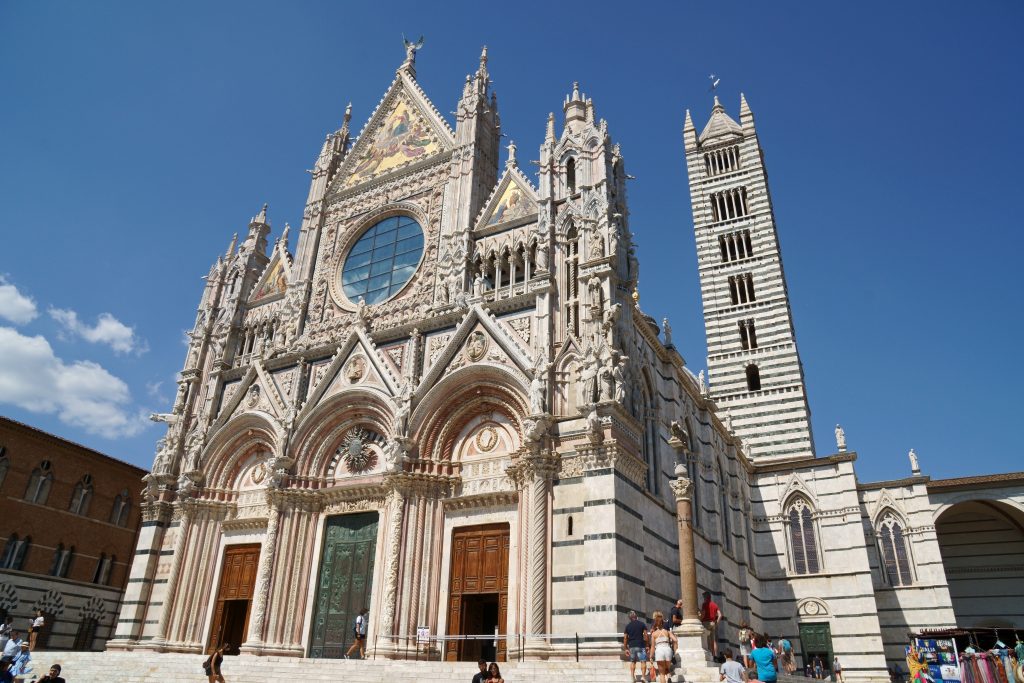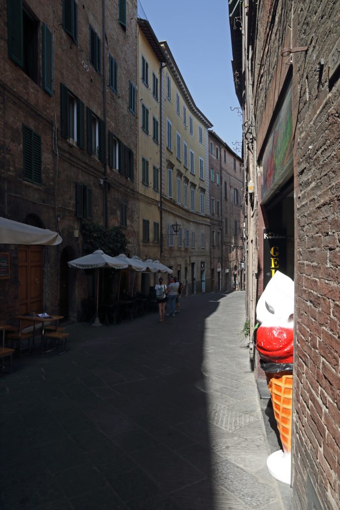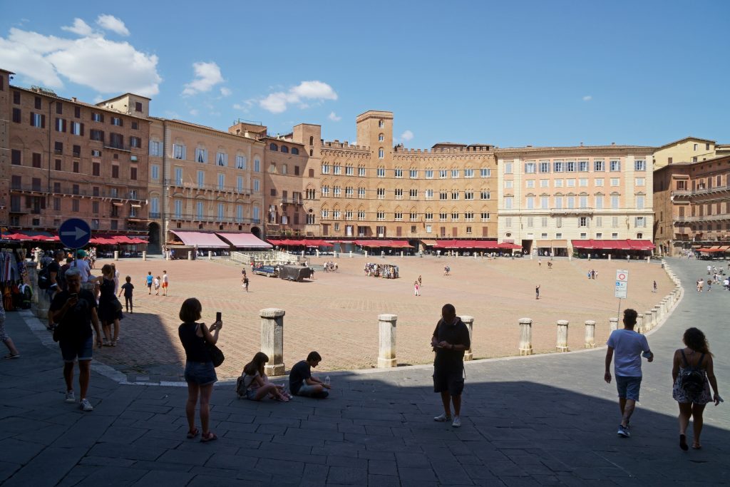 Das Auschecken vom Campingplatz verläuft problemlos, auch wenn wir diesmal die Chemietoilette zum ersten Mal zur „PC Kimik“-Station schleppen müssen. Unser erstes Ziel des Tages ist Greve in Chianti. Wir parken am Ortsrand und steigen aufs Fahrrad, um ins Zentrum zu gelangen. Einen richtigen Eindruck von der Stadt bekommen wir allerdings nicht – der Hauptplatz ist vollgestellt mit Marktständen. Außer 100 Gramm Schinken und ein paar Süßigkeiten aus der Pasticceria Ferruzzi Raffaello nehmen wir nichts mit. Als Erinnerung bleibt uns vor allem das Foto der Statue mit dem halben Torso am Marktplatz. Unser nächstes Ziel: die Campingplatzsuche in Siena – was sich zunächst als Illusion herausstellt. Der Platz Il Sabucco erweist sich als Fehlschlag: zwar ein attraktiver Shop, aber ein sonderbares und wenig einladendes Platzangebot. Also düsen wir weiter. Colleverde ist die deutlich bessere Wahl – zumindest angesichts der hohen Temperaturen und besagten Hügels im Namen lassen wir uns per Taxi ins Zentrum kutschieren. Allein die gewählte Route des Taxifahrers bestätigt unsere Entscheidung: enge Gassen, abwärts, aufwärts, dann wieder abwärts und wieder aufwärts, – nichts, was man freiwillig bei dieser Hitze mit dem Rad macht. Plötzlich stehen wir auf der berühmten Piazza del Campo – und sie ist wirklich beeindruckend. Weniger begeistert sind wir vom Eintrittspreis in die Kathedrale, weshalb wir den imposanten Dom von Siena, eines der bedeutendsten Beispiele gotischer Architektur, nur von außen bewundern. Dafür schauen wir uns zwei andere Kirchen an – und das kostenlos: San Francesco – eine schlichte, gotische Hallenkirche aus dem Jahr 1475, die dem heiligen Franz von Assisi gewidmet ist. Sie ist nahezu leer, was sie in ihrer Schlichtheit umso eindrucksvoller macht und San Maria de Provenzano – eine katholische Stiftskirche im späteren Renaissance- bzw. Barockstil von 1611. Ganz im Gegensatz zur ersten ist sie prachtvoll geschmückt, fast überladen. Per Taxi geht es zurück zum Campingplatz Colleverde. Die Fahrt ist kurz, unkompliziert – und bei der Hitze sehr willkommen. Den Rest des Tages verbringen wir wie gewohnt: mit Kaffee, Duschen, Abendessen und Warten auf die Nachtkühle.