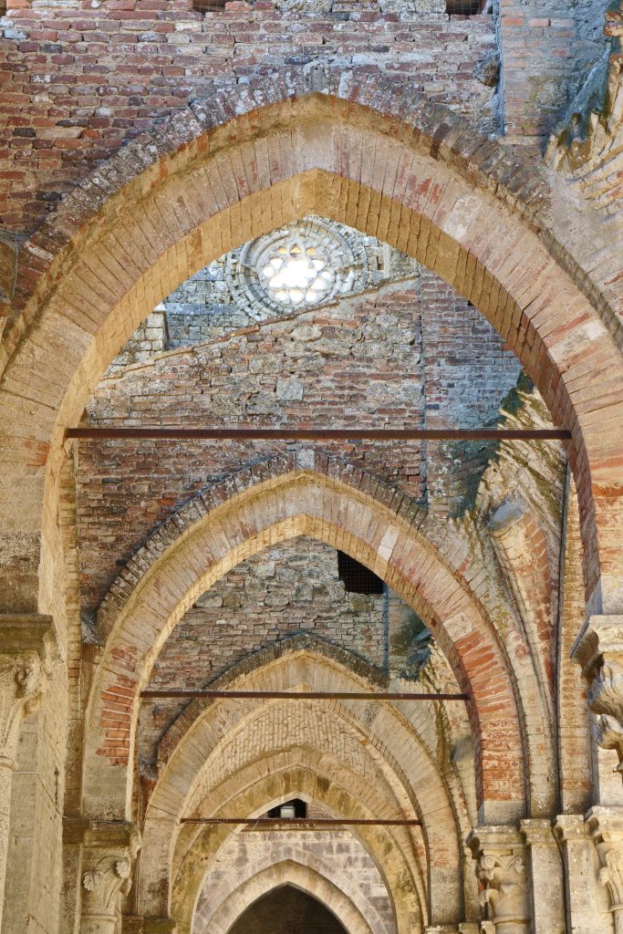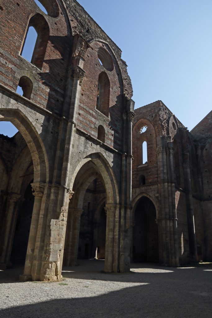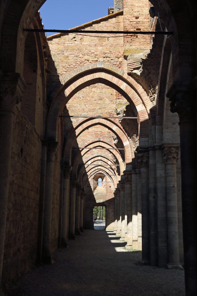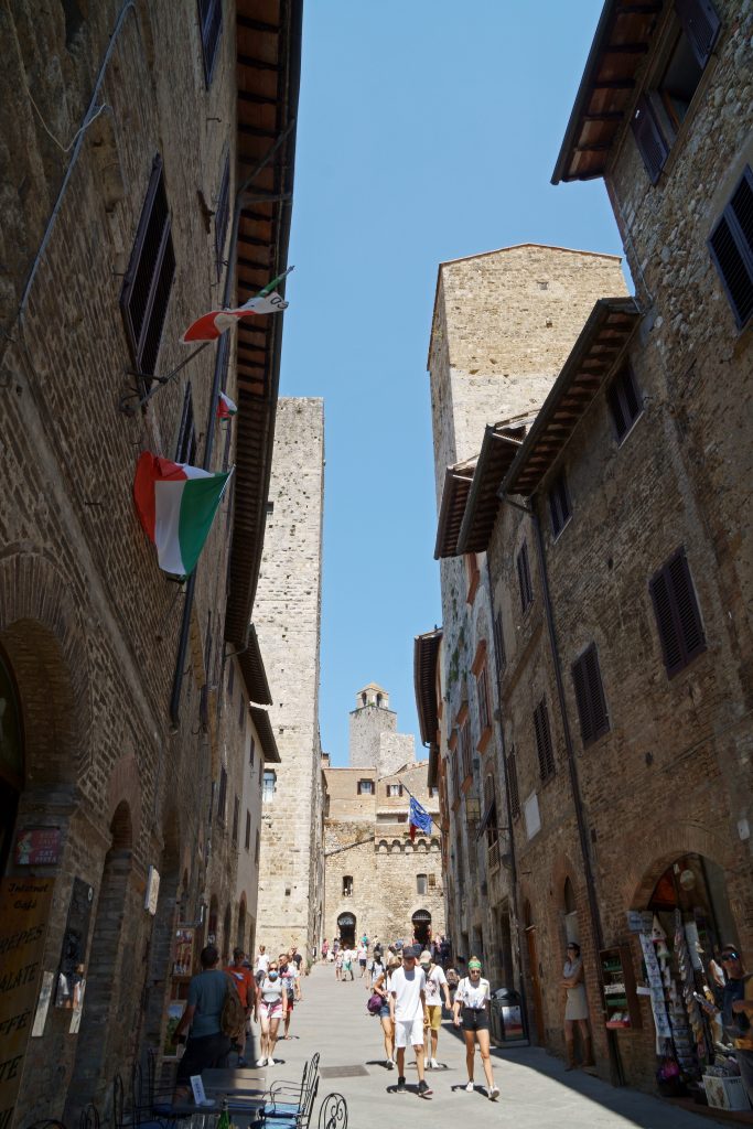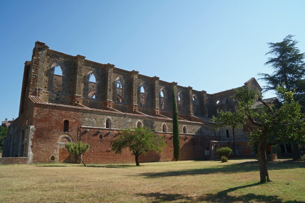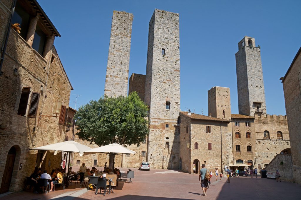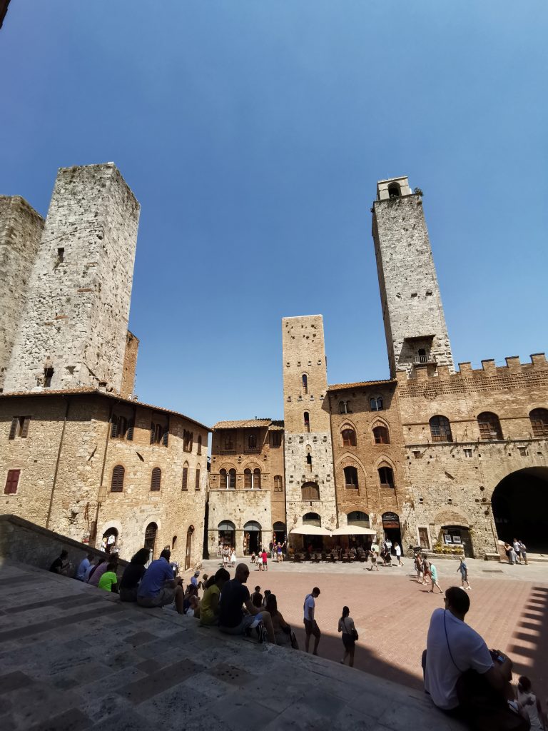 Ohne Wohnmobil-Service, aber mit dem dringenden Wunsch, dem wenig attraktiven Platz vom Vortag zu entkommen, brechen wir früh auf – Ziel ist die Abtei San Galgano. Gegen 09:40 Uhr erreichen wir sie, also rund 20 Minuten vor der offiziellen Öffnung um 10:00 Uhr – doch wir sind nicht die Ersten. Die Abtei San Galgano ist eine eindrucksvolle gotische Ruine aus dem 12. Jahr-hundert. Ihr Dach wurde 1786 durch einen Sturm zerstört, wenige Jahre nachdem die Zisterzienser das Kloster endgültig verlassen hatten. Die Kathedrale wirkt durch das fehlende Gewölbe fast wie ein Freilichtmuseum und verströmt eine ganz besondere Atmosphäre. Nur wenige Gehminuten entfernt, oberhalb des Hügels, befindet sich die runde Kapelle von Montesiepi, eine kleine romanische Kirche mit einer außergewöhnlichen Sehenswürdigkeit: dem Schwert im Stein. Der Legende nach wurde es dort von Galgano selbst hineingestoßen – als Zeichen seines Verzichts auf weltliche Gewalt. Unser nächstes Ziel ist San Gimignano, die berühmte toskanische Hügelstadt. Schon von Weitem erkennt man sie an den zahlreichen mittelalterlichen Türmen, weshalb sie oft als „Manhattan der Toskana“ bezeichnet wird. Die Altstadt ist von einer gut erhaltenen Stadtmauer aus dem 13. Jahrhundert umgeben, das Zentrum bildet die Piazza della Cisterna, ein malerischer, dreieckiger Platz, gesäumt von historischen Gebäuden. Um ein erneutes Campingdesaster wie am Vortag zu vermeiden, fahren wir zuerst den Campingplatz an – und siehe da – alles klappt problemlos. Wir dürfen uns sogar selbst einen Platz aussuchen und haben ausreichend Fläche, um es uns gemütlich zu machen. Nach einer kurzen Pause brechen wir zu Fuß ins Zentrum auf. Der Bus fährt direkt vom Campingplatz und bringt uns ohne Umstände in die Altstadt. Natürlich gelten auch hier die Coronaregeln, und der Fahrer achtet konsequent darauf. Wie in vielen toskanischen Städten geht es auch hier bergauf, vorbei an zahllosen Cafés, Pizzerien und Souvenirläden, die – wie so oft – immer das gleiche touristisches Sortiment anbieten. Die Bausubstanz ist wunderschön und gut erhalten, doch es fällt schwer, das Reale vom rein Touristischen zu trennen. Man fragt sich unweigerlich, wie sinnvoll es wirklich ist, jede dieser bekannten Toskanastädte zu besichtigen – sie ähneln sich doch sehr. Typisch ist auch der Ablauf: Man spaziert durch die Gassen, bestaunt Kirchen, Türme und Plätze, fotografiert wie alle anderen Touristen fleißig drauflos – um später nicht mehr zu wissen, welches Motiv zu welchem Ort gehörte. Dann folgt der Rückweg: entweder zu den oft weit entfernten und für Wohnmobile noch weiter gelegenen Parkplätzen, oder – wie in unserem Fall – bequem mit dem Bus zurück zum Campingplatz. Fast hätten wir dabei an der falschen Haltestelle gewartet und später auch fast die richtige zum Aussteigen verpasst. Der Tag endet mit dem üblichen Campingritual: Duschen, Essen, Warten auf Abkühlung – und irgendwann endlich einschlafen.