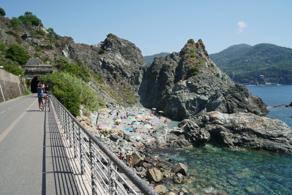 Wir verlassen den überraschend positiven Campingplatz bei Pisa und machen uns auf den Weg in die Cinque Terre, genauer gesagt nach Levanto. Eigentlich hatten wir eine reibungslose Fahrt erwartet – doch es kommt anders. Zunächst geraten wir kurzfristig auf die falsche Route. Besonders nervig wird es dann im Stadtverkehr von La Spezia, inklusive Umleitung und einer Navigationskatastrophe: Das Mercedesnavi, das Surface-Tablet mit der Karten-App und die menschliche Navigationseinheit liegen allesamt im Clinch. Zu allem Überfluss piepst es – vermutlich eine Warnung – vermutlich vor einem zu niedrigen Tunnel. Der letzte Abschnitt vor Levanto erinnert eher an einen engen Alpenpass: zahlreiche Serpentinen, Gegenverkehr, parkende Autos am Straßenrand. Beim Durchfahren von Downtown Levanto ist unser erster Eindruck eher ernüchternd: Touristisch, laut, dicht, und der Strand besteht aus einer endlosen Reihe von Sonnenschirmen – genau das, was wir nicht gesucht haben. Immerhin finden wir den Campingplatz Acqua Dolce auf klassische Art – ganz ohne Navi, nur mit Hilfe der Straßenschilder. Der Platz ist ordentlich, aber eng – und für das kommende Wochenende bereits ausgebucht. Heute jedoch haben wir Glück: Bis Freitag dürfen wir bleiben. An der Rezeption empfängt uns eine freundliche Dame, die gut Englisch spricht, unser Stellplatz ist dann zum Glück weniger eng als befürchtet, und unsere „Nachbarschaft“ besteht überwiegend aus Germanskis – darunter auch ein Schweizer. Unverschämterweise gibt es in 30 Metern Entfernung sogar jemanden, der Italienisch spricht. Unsere erste Unternehmung: Radfahren – was sonst? Direkt am Strand beginnt ein wunderschöner Radweg durch mehrere ehemalige Eisenbahntunnel zu den beiden Nachbarorten. Der Weg ist bestens ausgebaut, ebenerdig und wirkt fast so, als wäre er extra für uns geschaffen worden. Zwischen den Tunneln erhaschen wir immer wieder Blicke auf vermeintlich einsame Buchten – wobei das Wort „einsam“ hier nur mit Anführungszeichen und viel Fantasie gilt. Trotzdem: Der Ausflug gefällt uns sehr. Wir fahren, solange es geht, und kehren dann wieder um. Der Versuch, an einer der erwähnten „einsamen“ Buchten ins Wasser zu springen, scheitert kläglich – mangels persönlicher Klippeneignung-. Also erreichen wir fast trocken wieder Levanto. Wir nehmen uns vor, noch den Hafen zu erkunden – doch dieser verdient seinen Namen nicht wirklich: ein paar Boote, keine Stege, keine Bereiche, an denen boote vor Anker liegen. Die Absicht, ein Privatboot für den nächsten Tag zu mieten, verwerfen wir angesichts des Angebots. Stattdessen hoffen wir, morgen mit einem Linienboot die Cinque-Terre-Städtchen abzufahren, die Rückfahrt erfolgt dann eventuell per Boot und Zug – sofern alles klappt. Der Abend verläuft wieder klassisch: Duschen, dann als Dinner ein wahrer Klassiker – Wiener Würstchen, vakuumverpackt, bei Lidl vor zwei Tagen gekauft und heute bereits zum vierten Mal auf unserer Abendkarte. Gar köstlich, immerhin kühlt es am Abend leicht ab – was Hoffnung auf eine erträgliche Nacht macht.